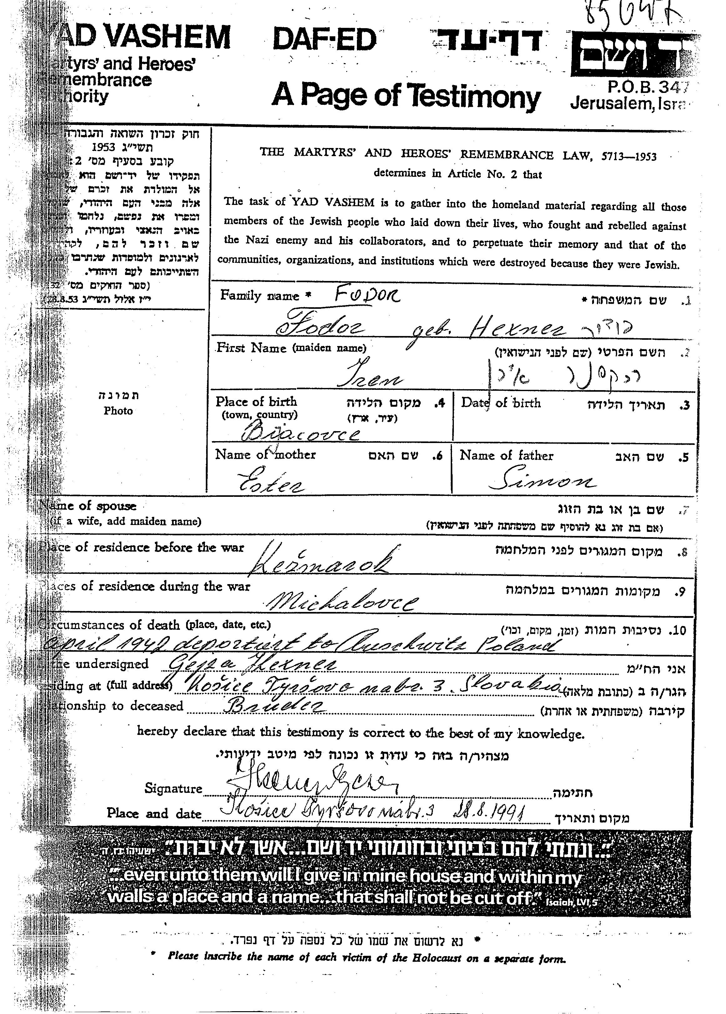 Fodor Iren Kezmarok, Tchécoslovaquie Feuille de témoignage