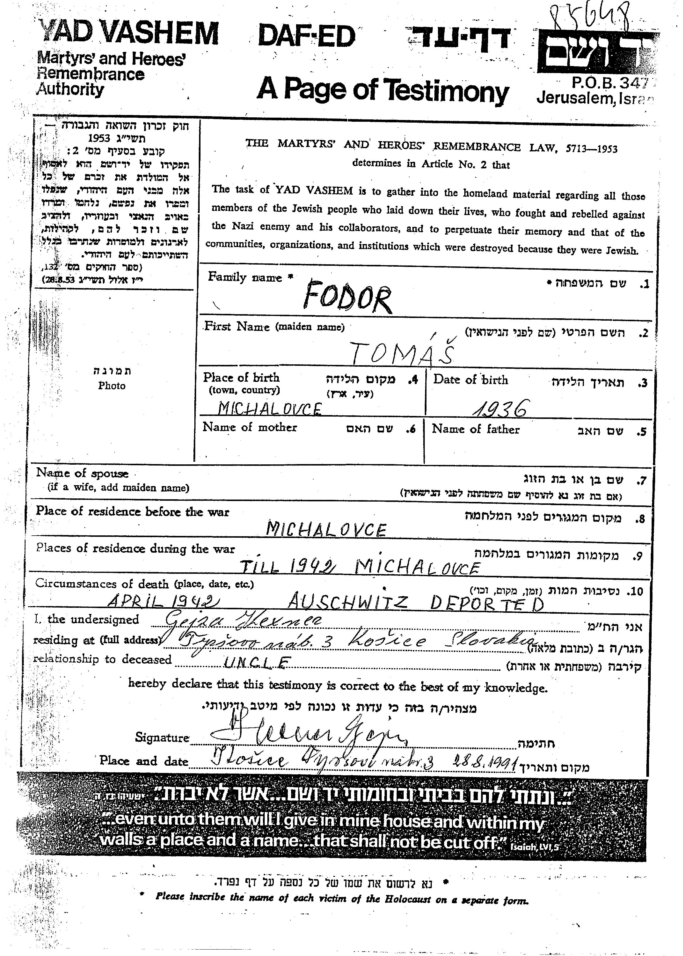 Fodor Tomas 1936 Michalovce, Tchécoslovaquie Feuille de témoignage