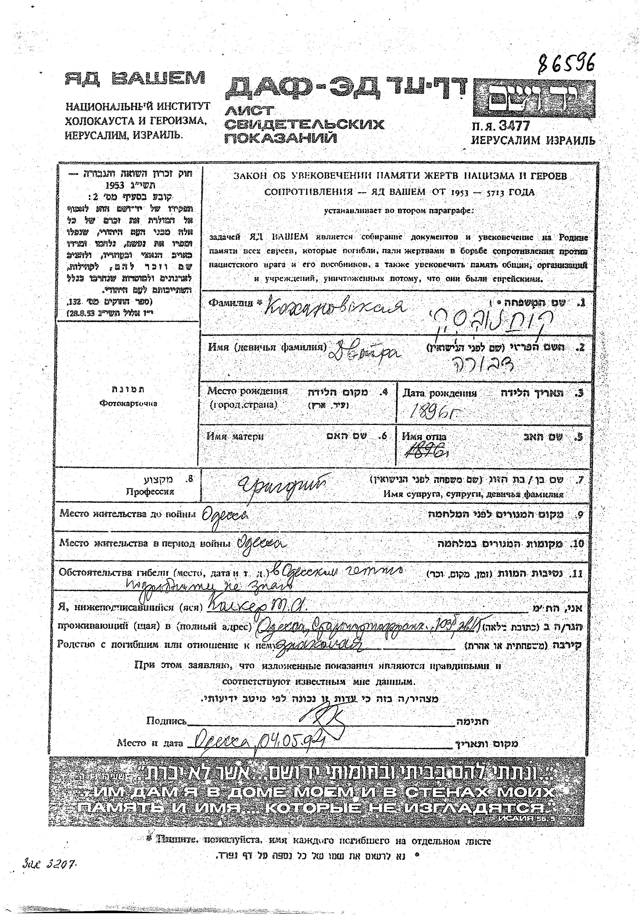 Kokhanovski Dvoira 1896 Odessa, Ukraine (URSS) Feuille de témoignage