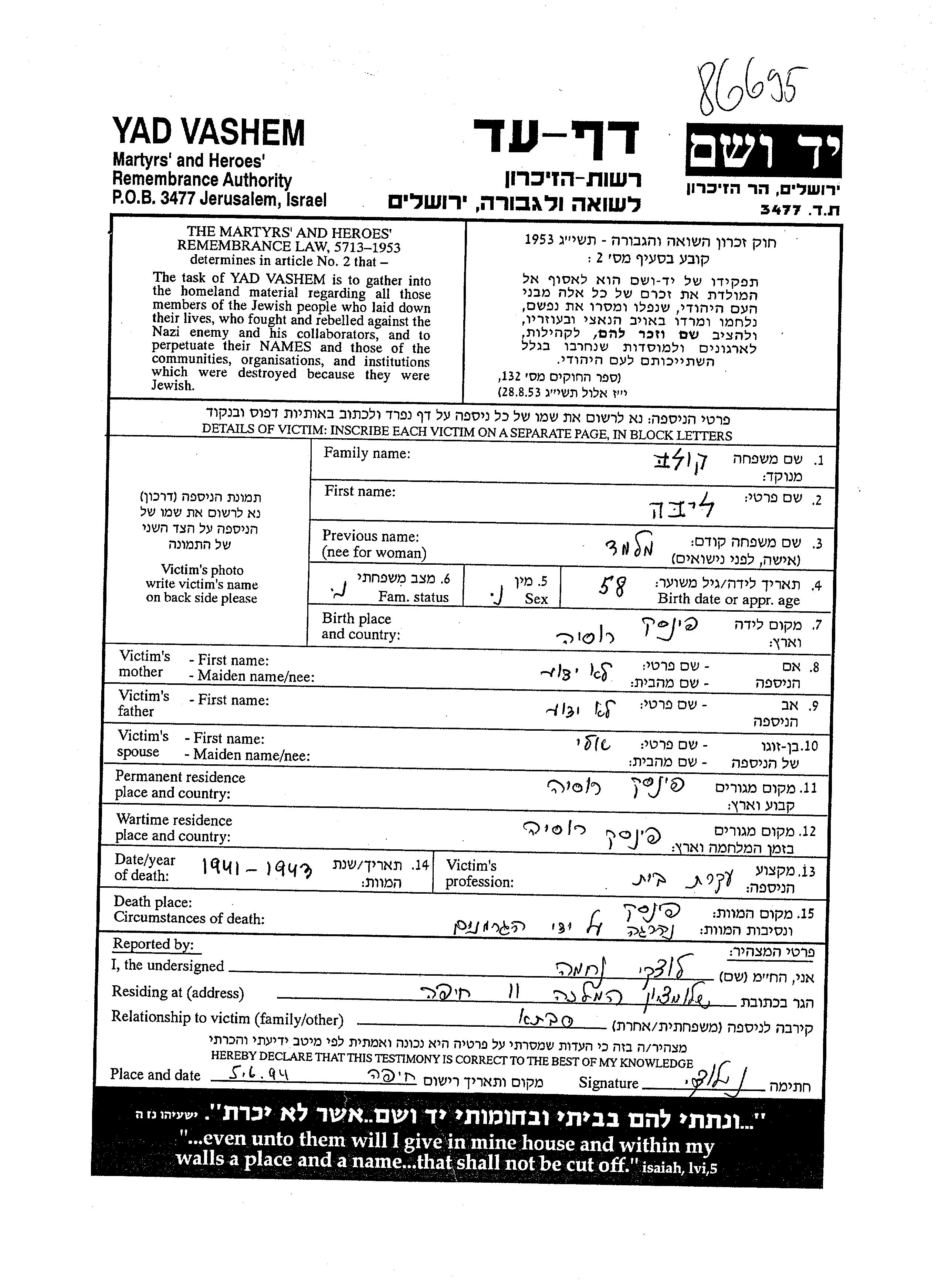 Yad Vashem - Pages of Testimony Names Memorial Collection