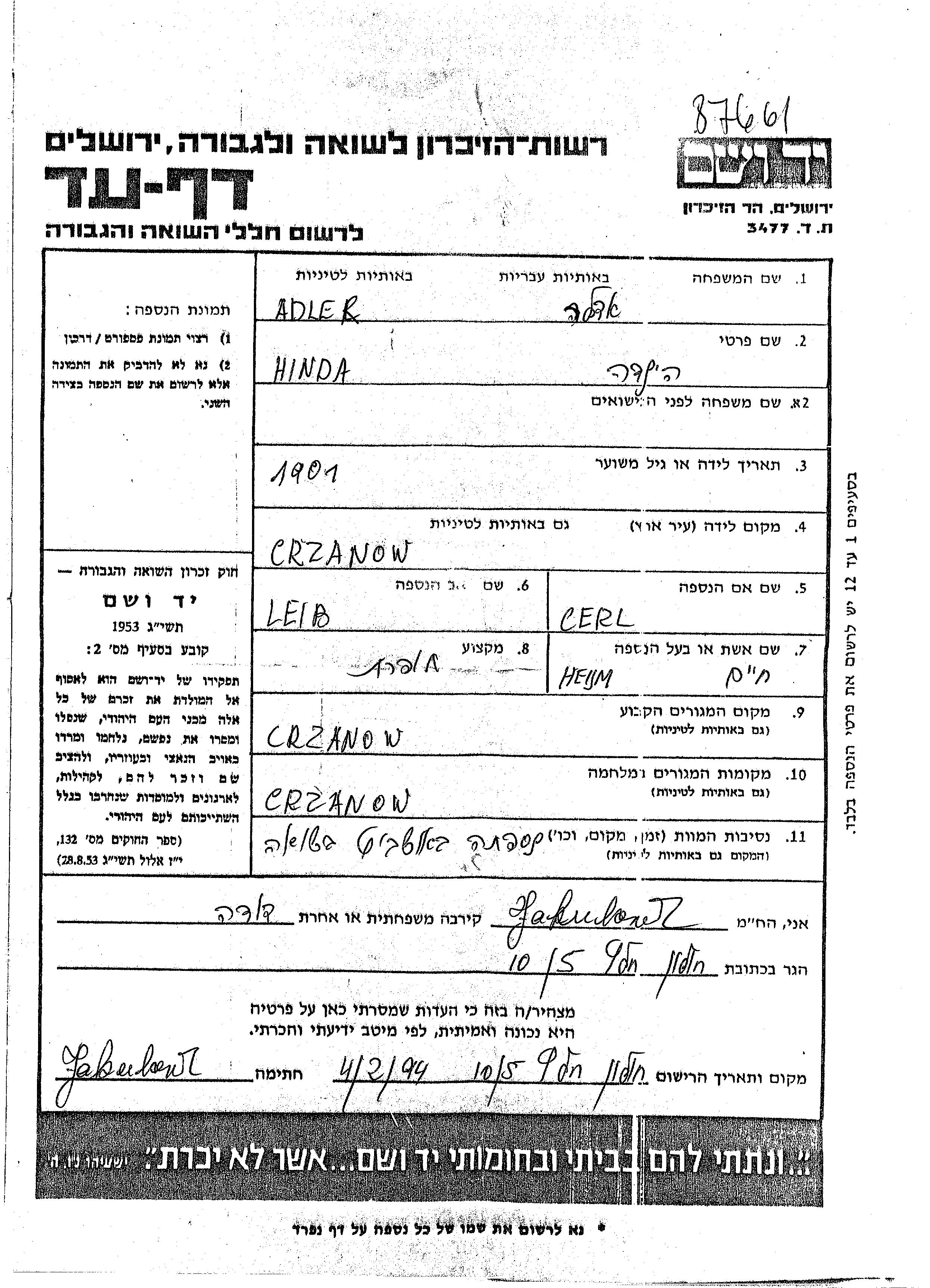 Adler Hinda 1901 Chrzanow, Pologne Feuille de témoignage
