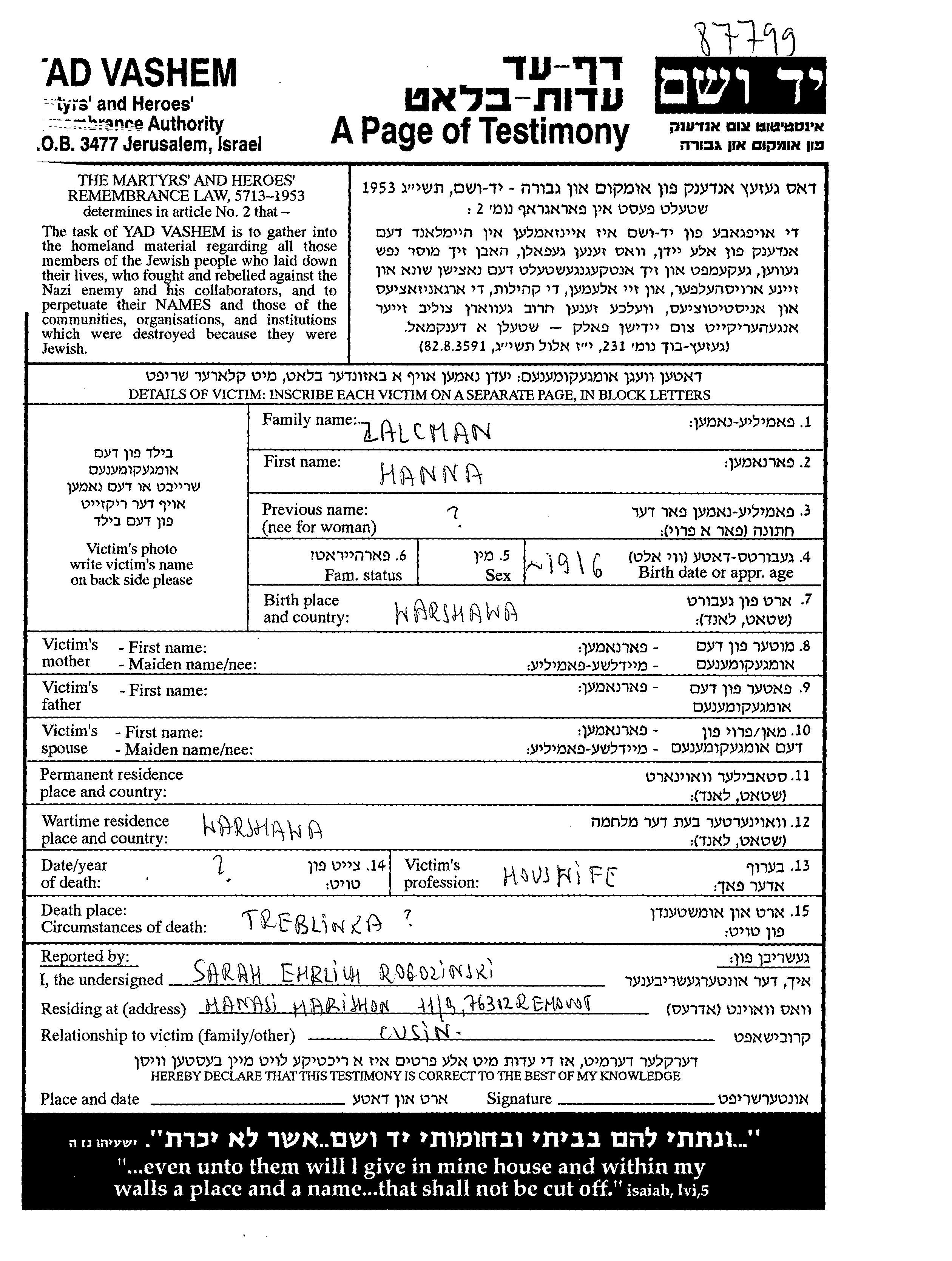 Zalcman Hanna 1916 endroit inconnu, Feuille de témoignage