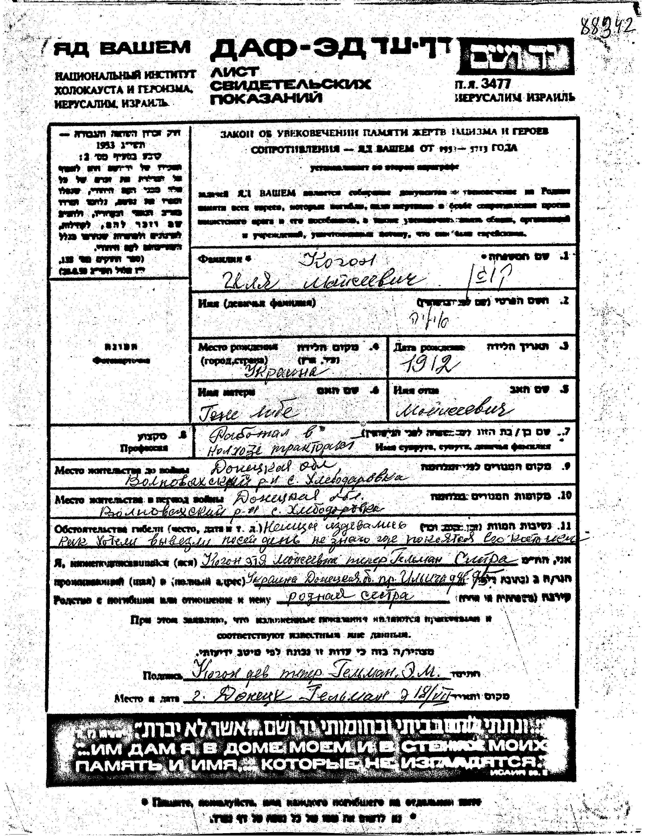 Kogan Ilya 1912 Khlebodarovka, Ukraine (URSS) Feuille de témoignage