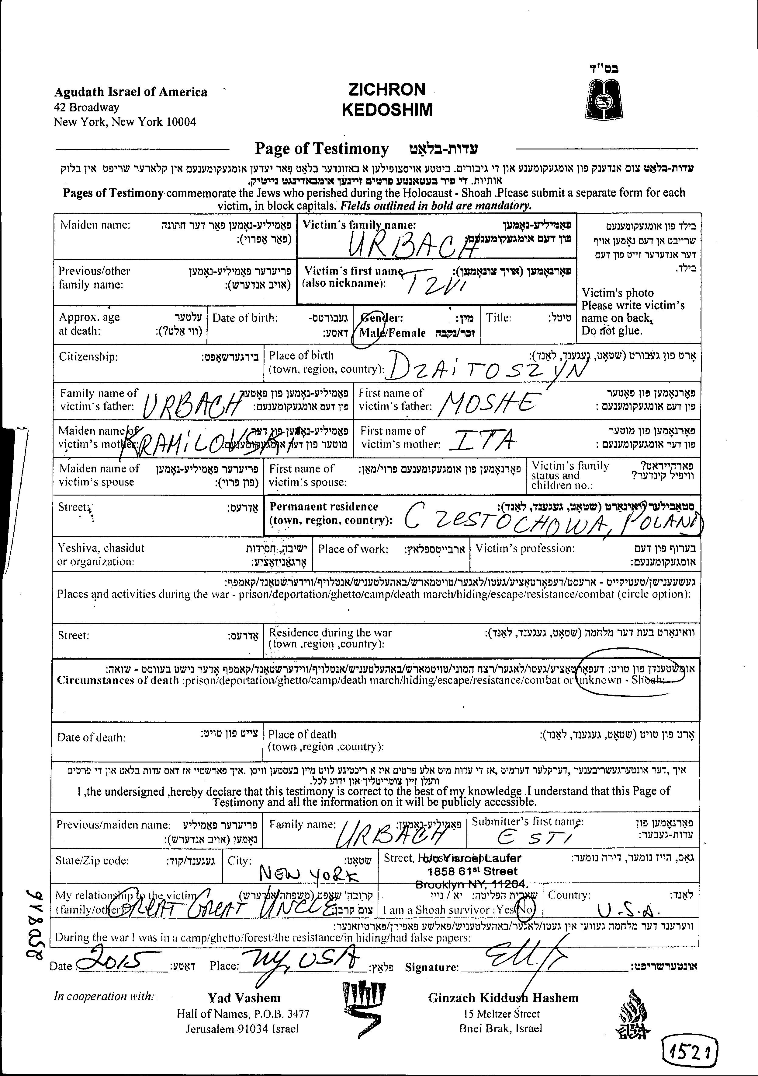 Urbach Tzvi Czestochowa, Pologne Feuille de témoignage
