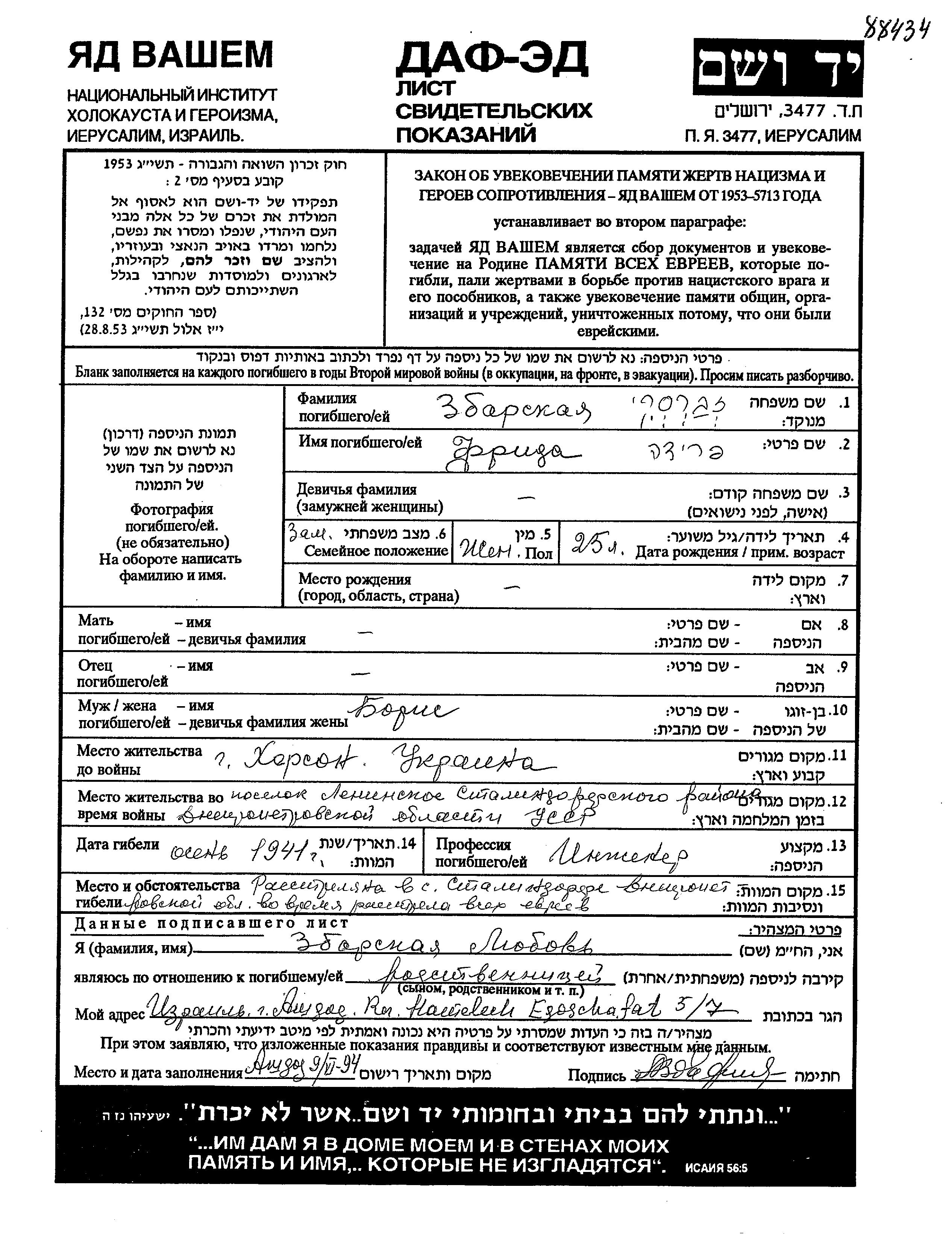 Zbarski Frida 1916 Kherson, Ukraine (URSS) Feuille de témoignage