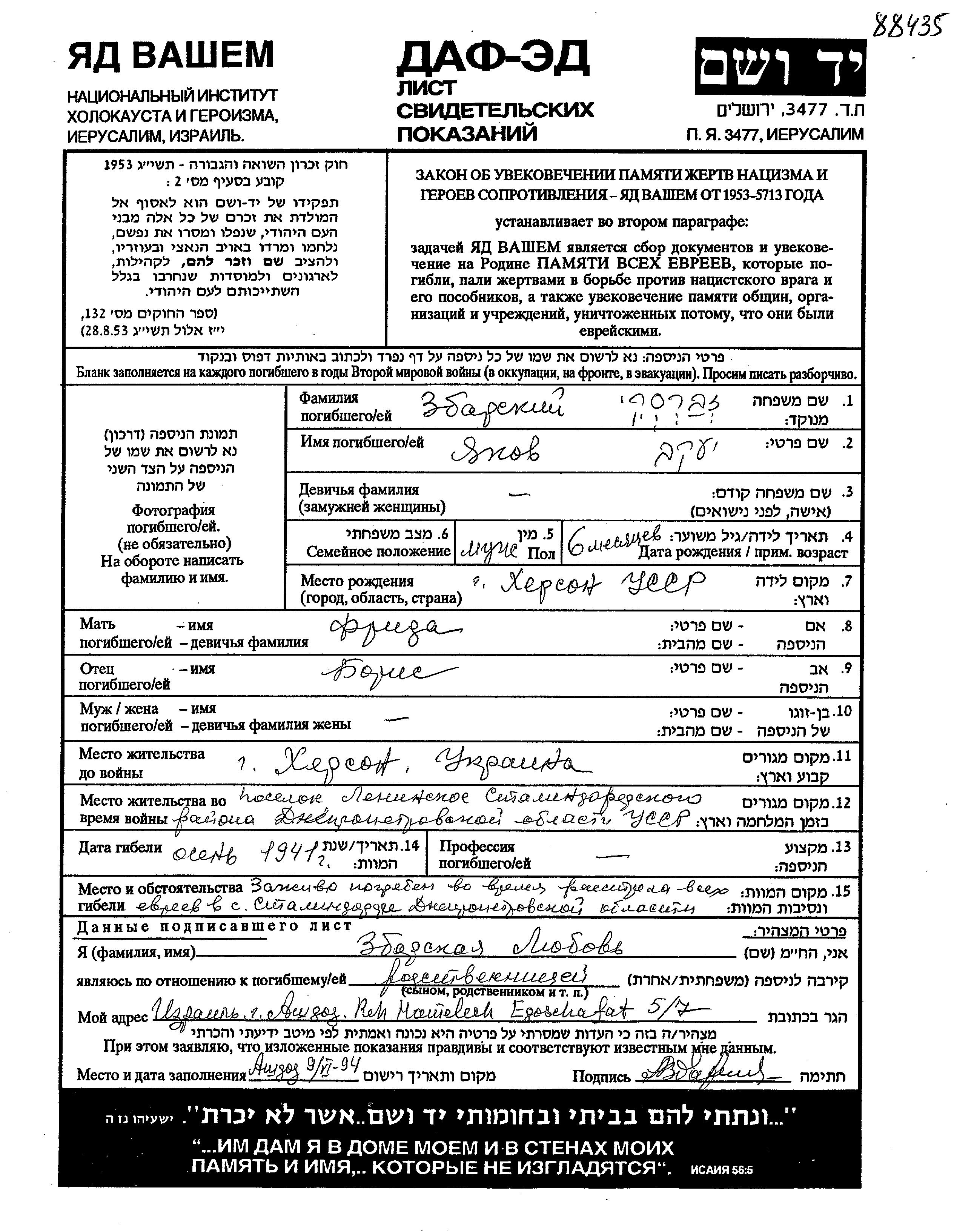 Zbarski Yakov 1941 Kherson, Ukraine (URSS) Feuille de témoignage