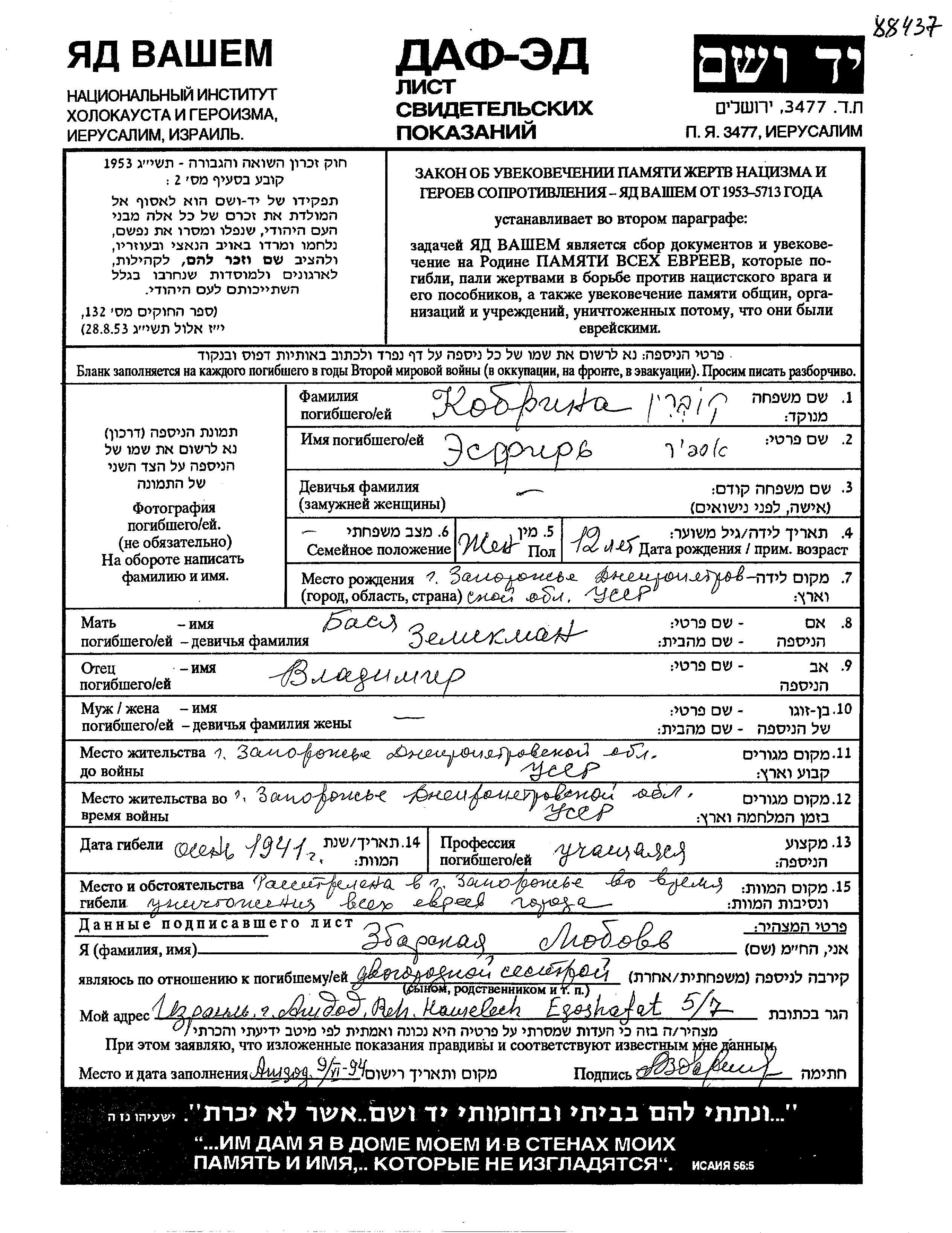 Kobrin Esfir 1929 Zaporozhye, Ukraine (URSS) Feuille de témoignage