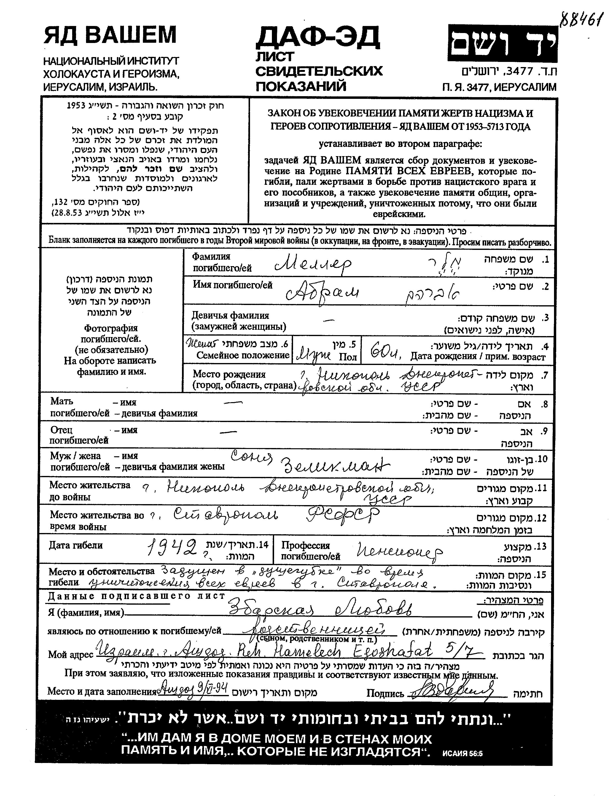 Meler Maler Abram 1882 Nikopol, Ukraine (URSS) Feuille de témoignage