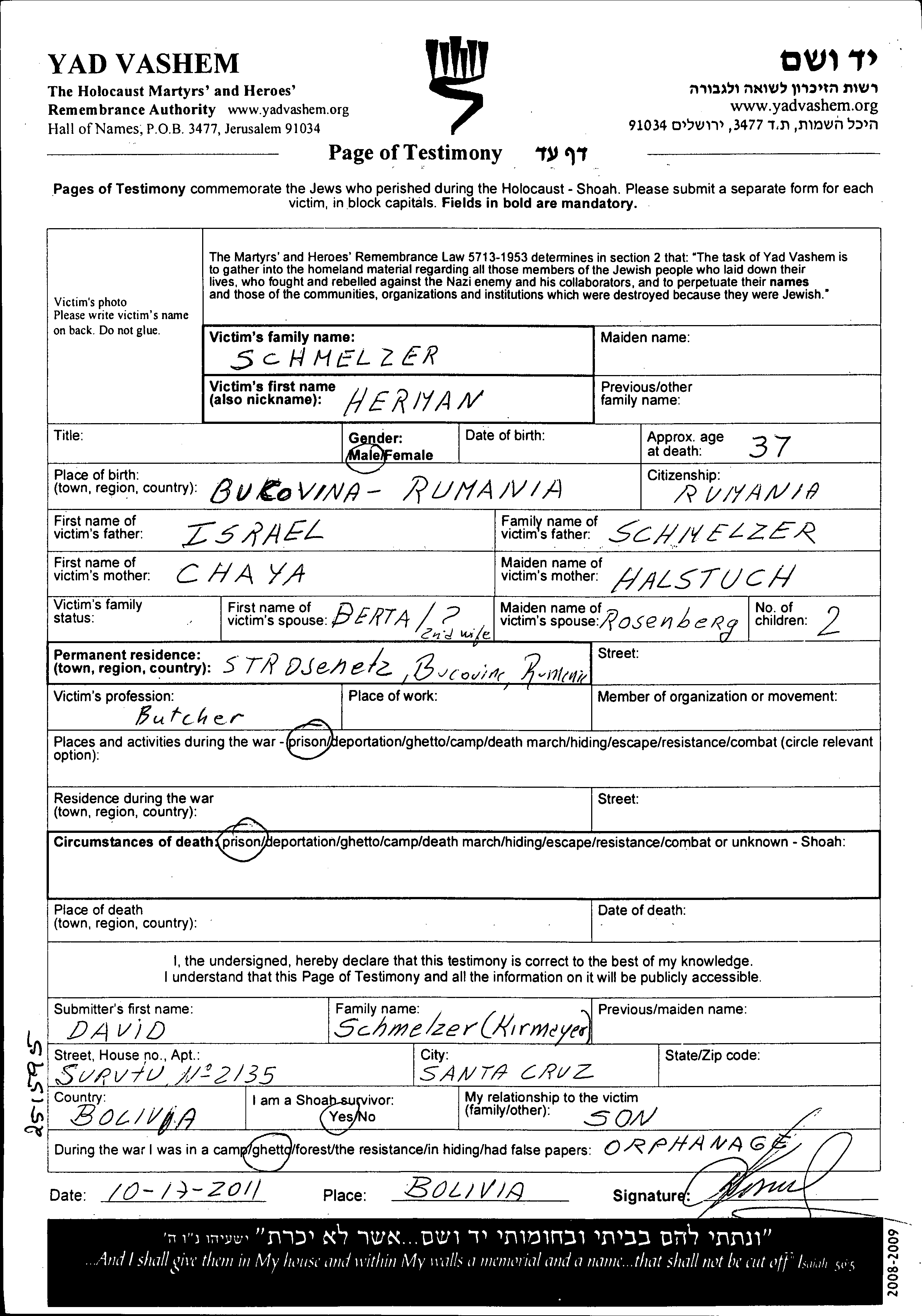 Schmelzer Herman Storojinet, Roumanie Feuille de témoignage