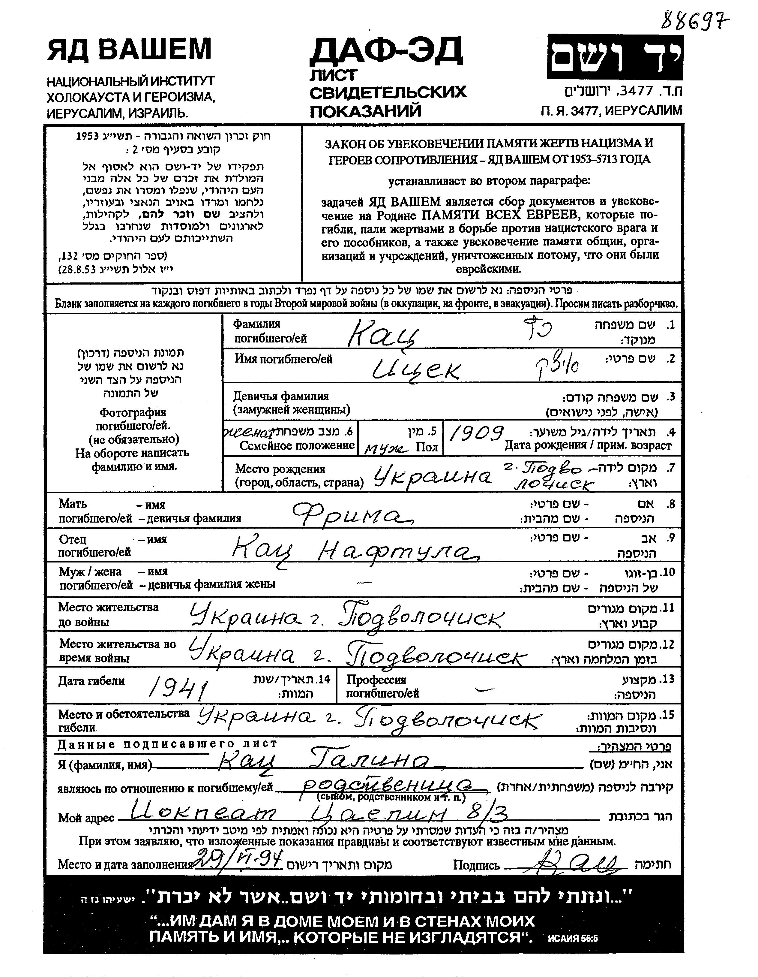 Yad Vashem - Pages of Testimony Names Memorial Collection