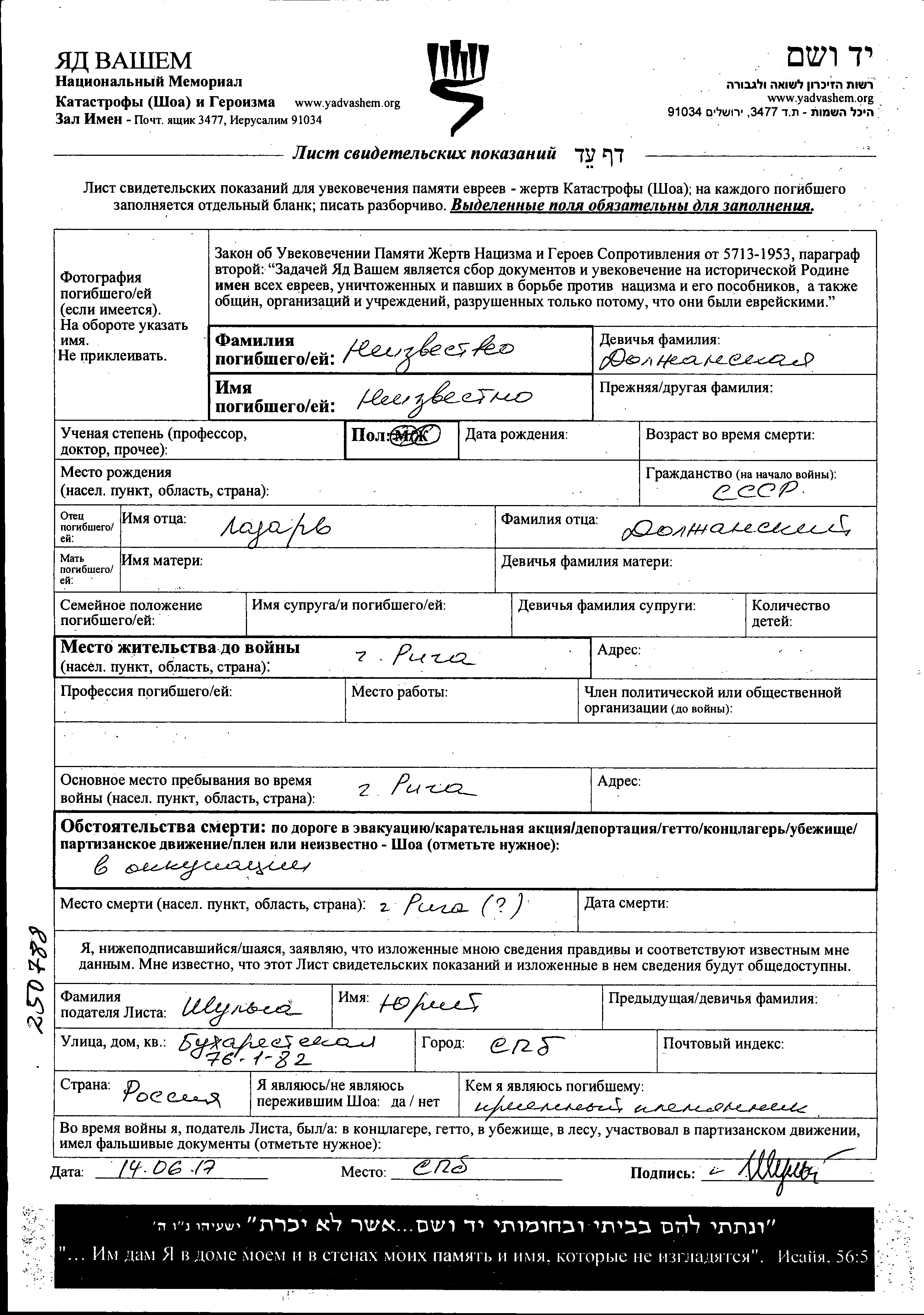 Lieu de résidence pendant la guerre/Shoah