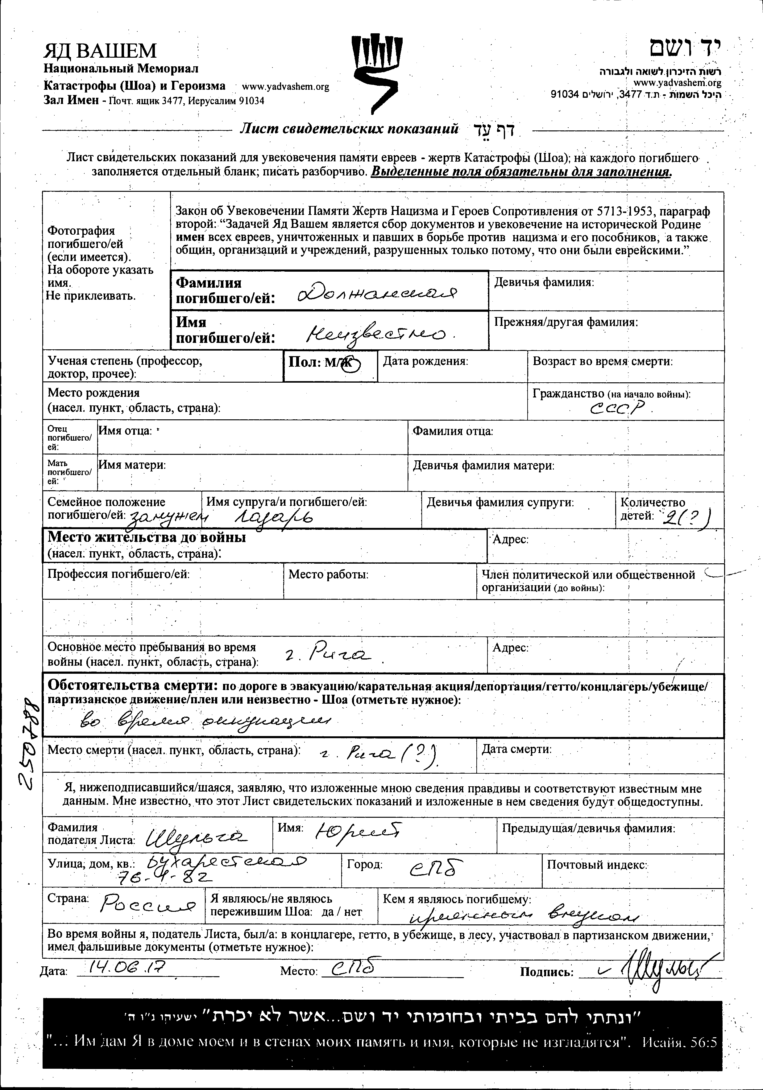 Dolzhanskaya prénom inconnu endroit inconnu, Feuille de témoignage