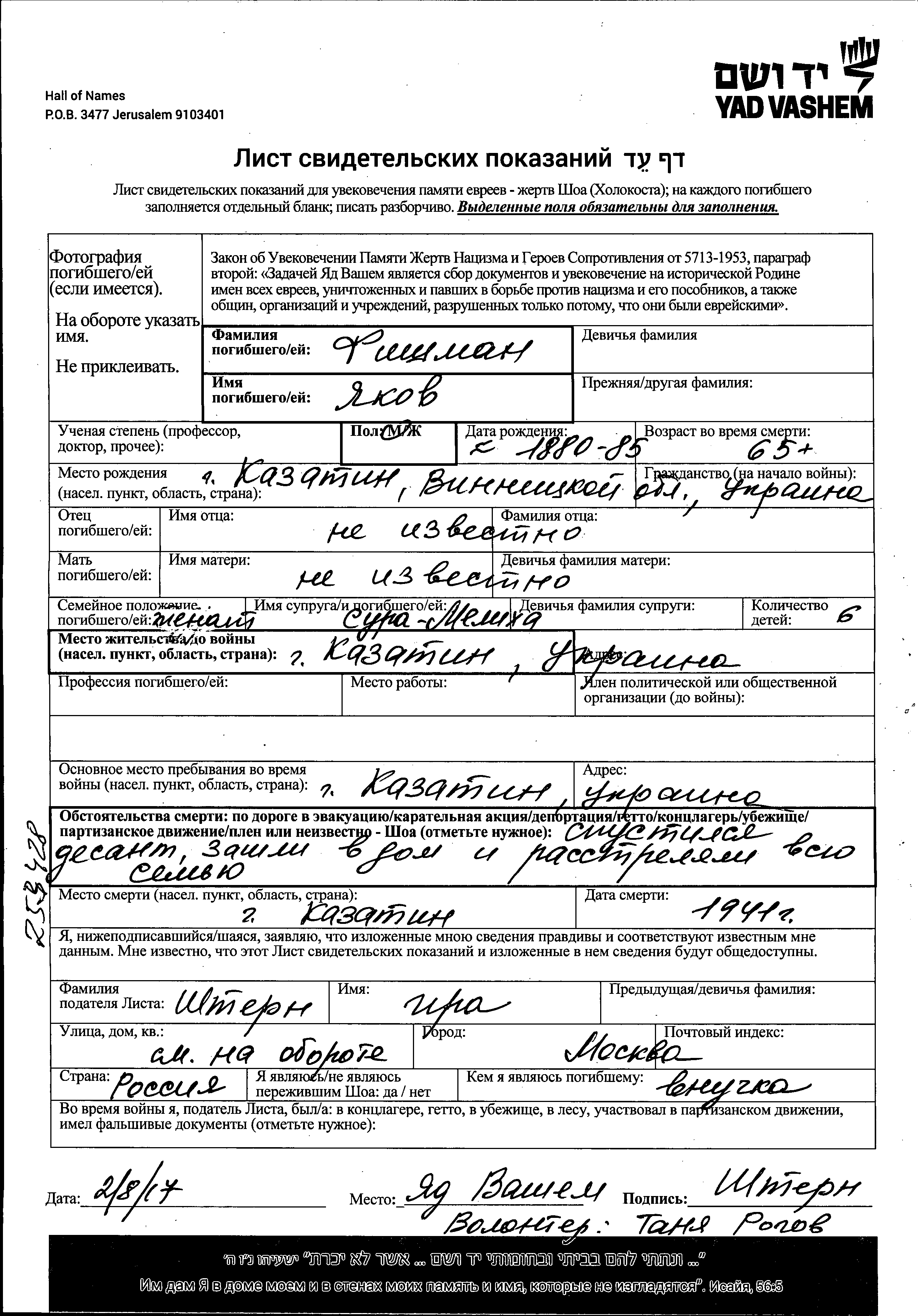 Yakov a été assassiné pendant la Shoah. Lieu de la mort: Kazatin, Ukraine (URSS) en 1941.