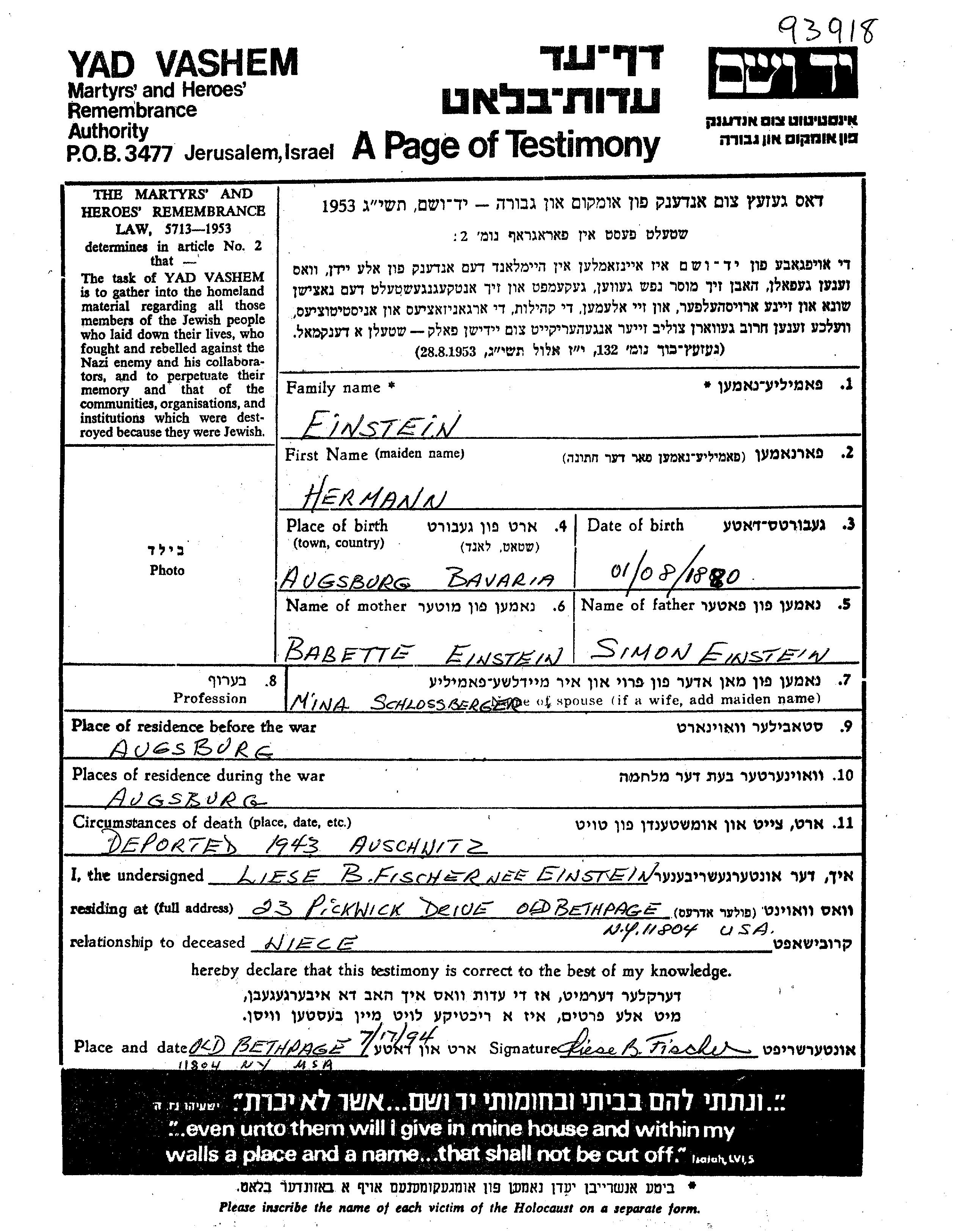 Hermann Einstein est né à Augsburg, Allemagne en 1880, fils de Simon et de Babette. Il était Mariée à Mina née Schlossberger. Avant la seconde guerre mondiale il vivait à Augsburg, Allemagne. Au cours de la guerre, il était à Augsburg, Allemagne.