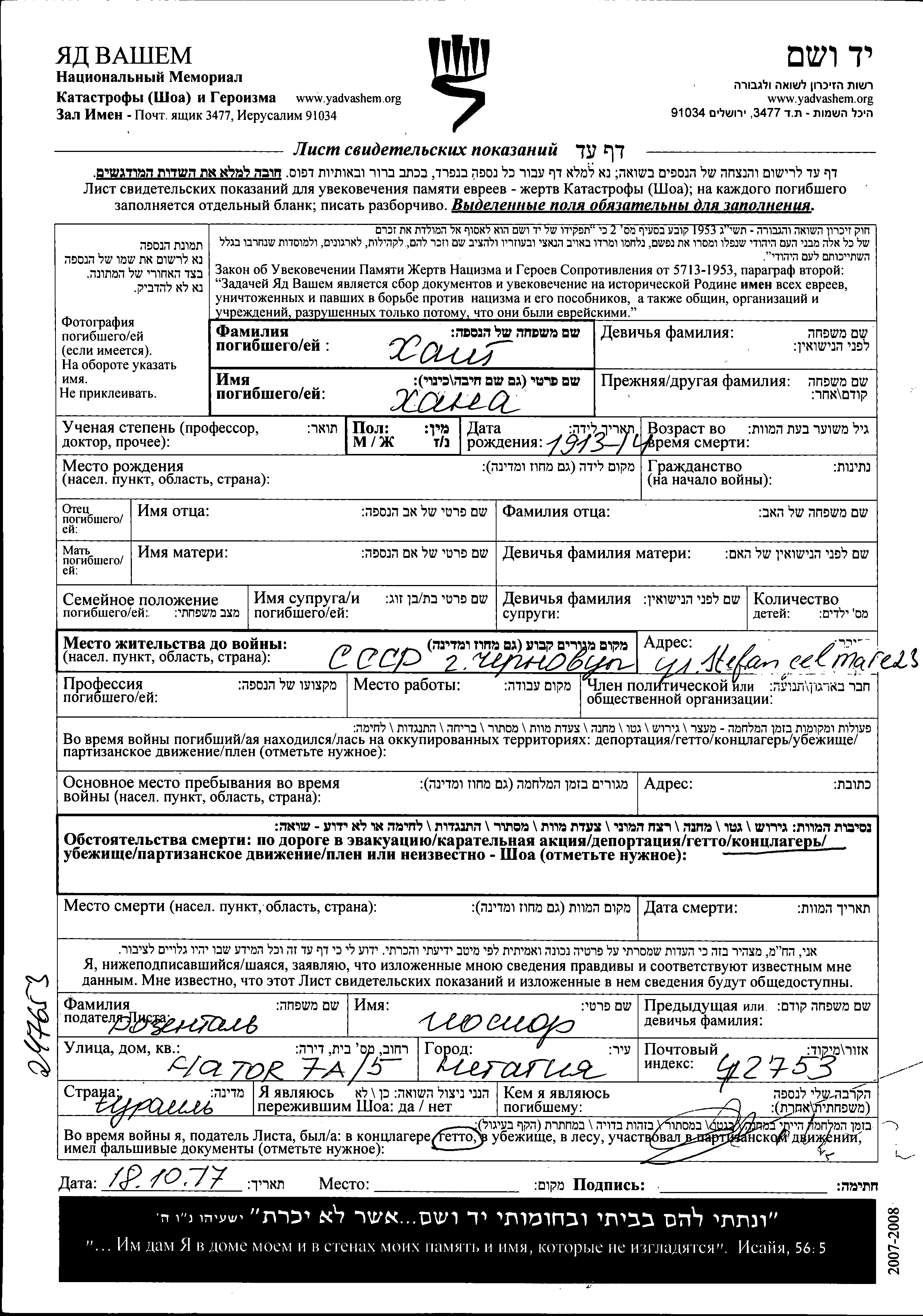 Yad Vashem - Pages of Testimony Names Memorial Collection