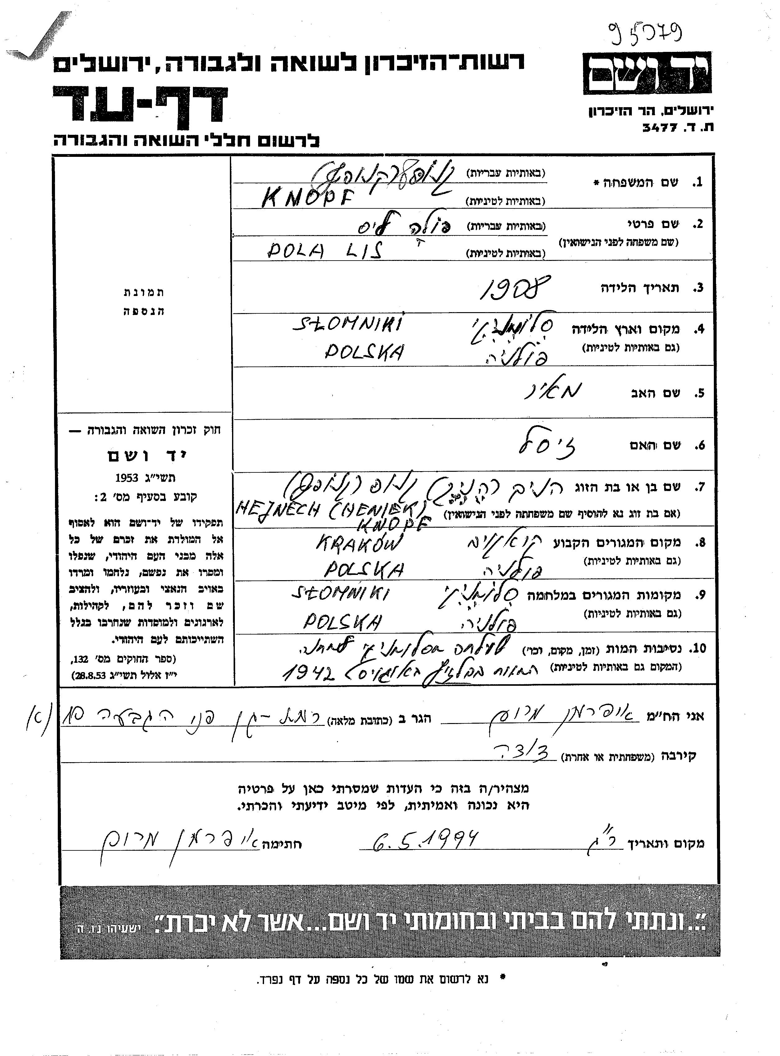 Pola Knopf née Lis est née à Slomniki, Pologne en 1908, fille de Meir et de Zisel. Elle était Mariée à Hejnech Heniek. Avant la seconde guerre mondiale elle vivait à Krakow, Pologne. Pendant la guerre, elle était à Slomniki, Pologne.