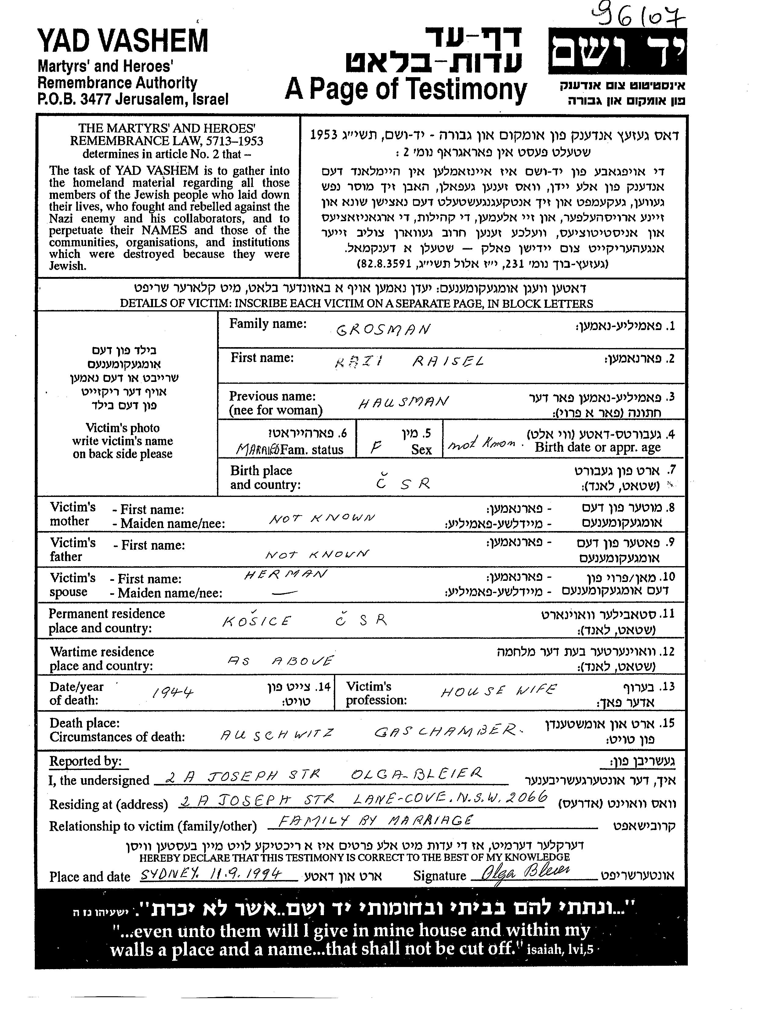 Grosman Raisel Kosice, Tchécoslovaquie Feuille de témoignage