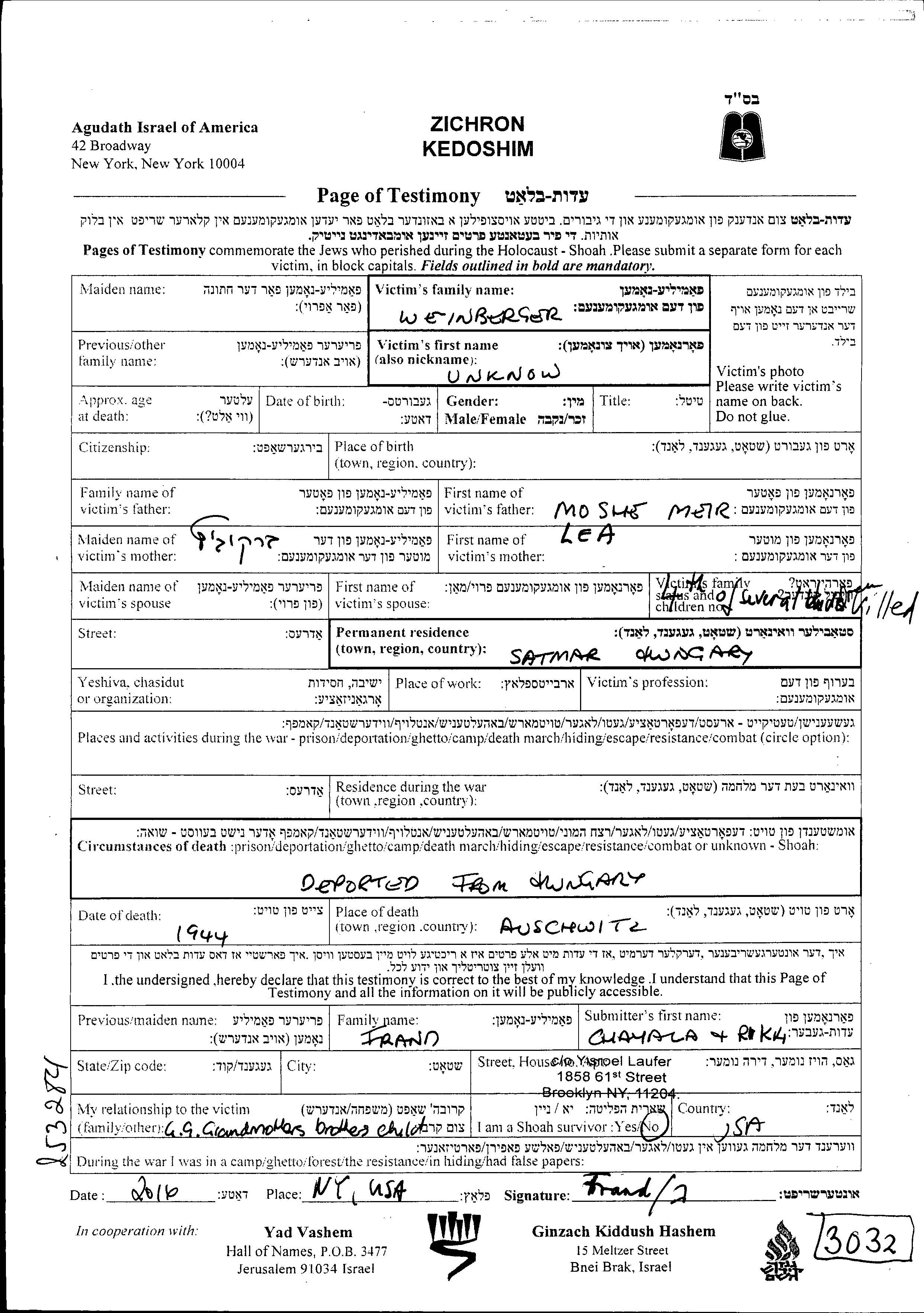 Weinberger prénom inconnu Satu Mare, Roumanie Feuille de témoignage