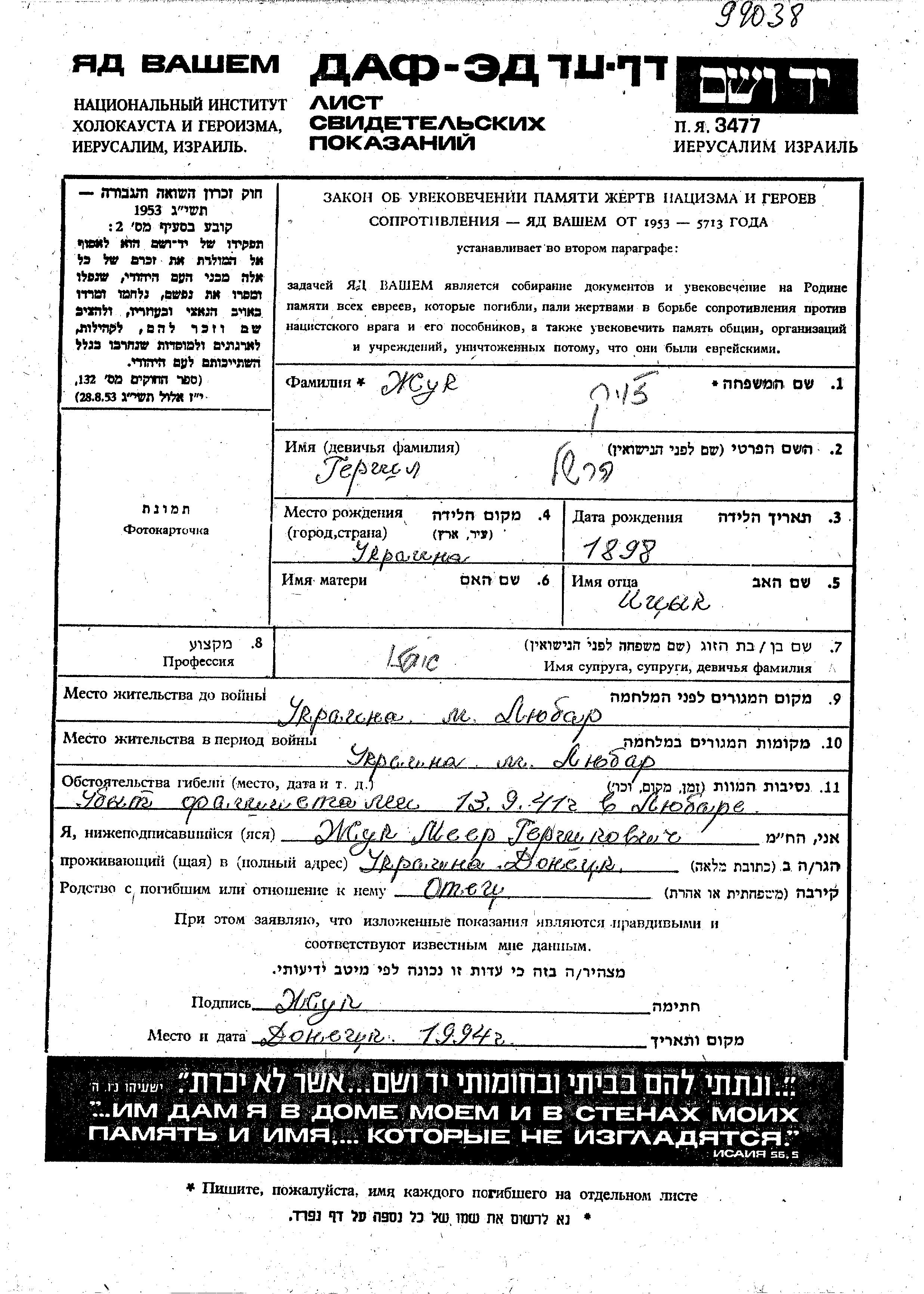 Zhuk Gershl 1898 Lyubar, Ukraine (URSS) Feuille de témoignage