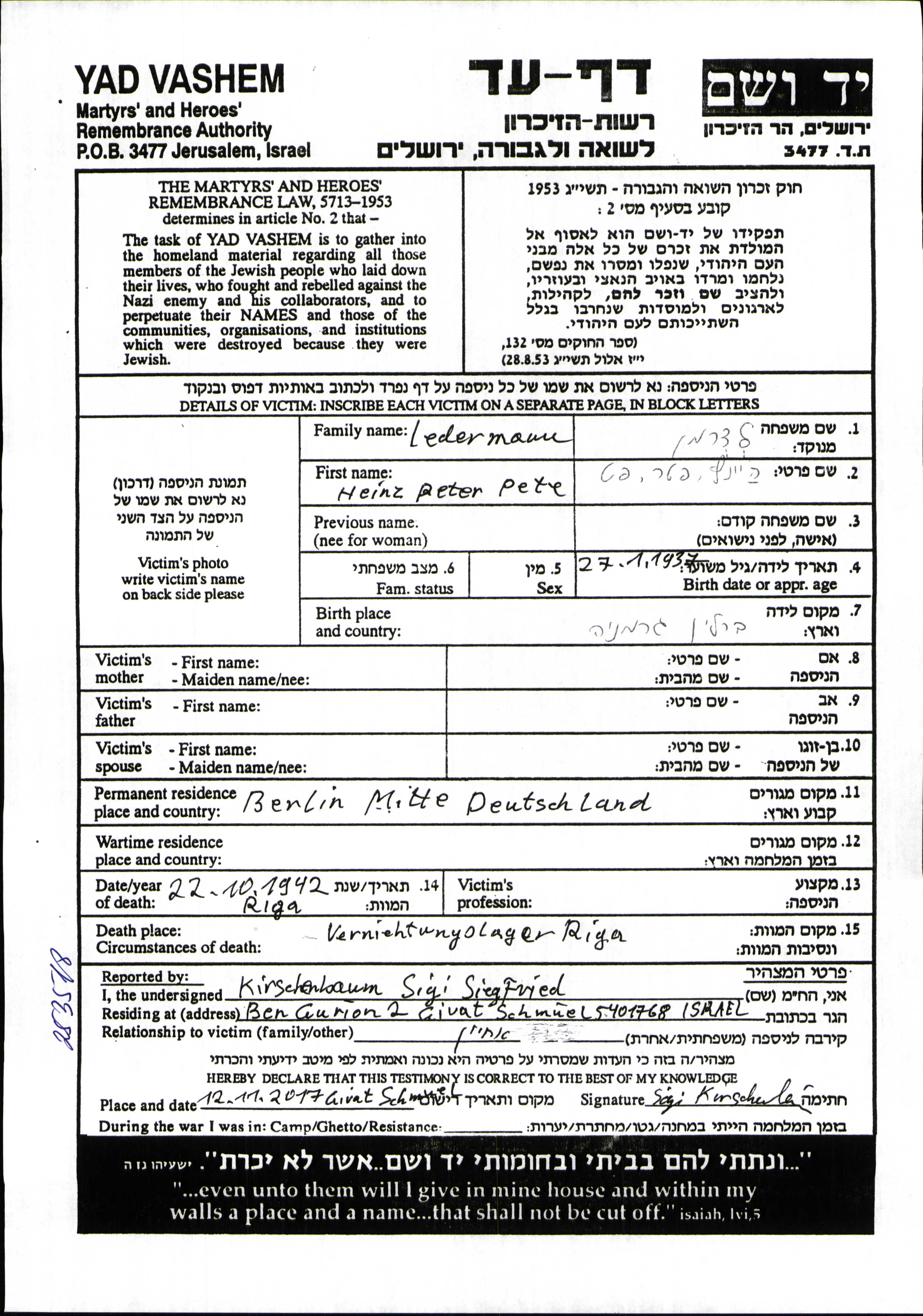 Heinz Pete a été assassiné pendant la Shoah. Lieu de la mort: Riga, Lettonie en 22/10/1942.