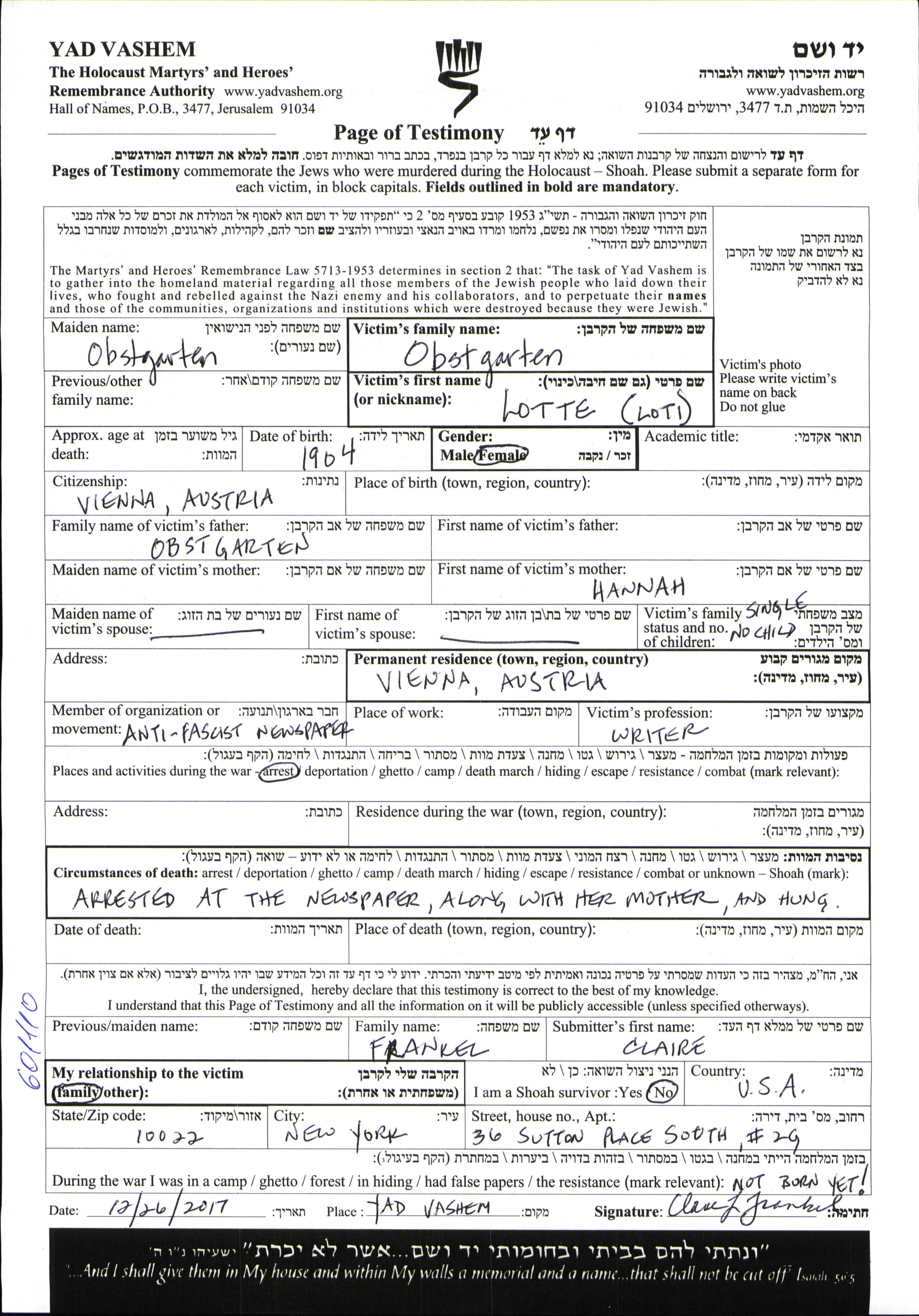 Lotte Obstgarten est née en 1904, fille de Hannah. Elle était Journaliste et Célibataire. Avant la seconde guerre mondiale elle vivait à Vienna, Autriche.