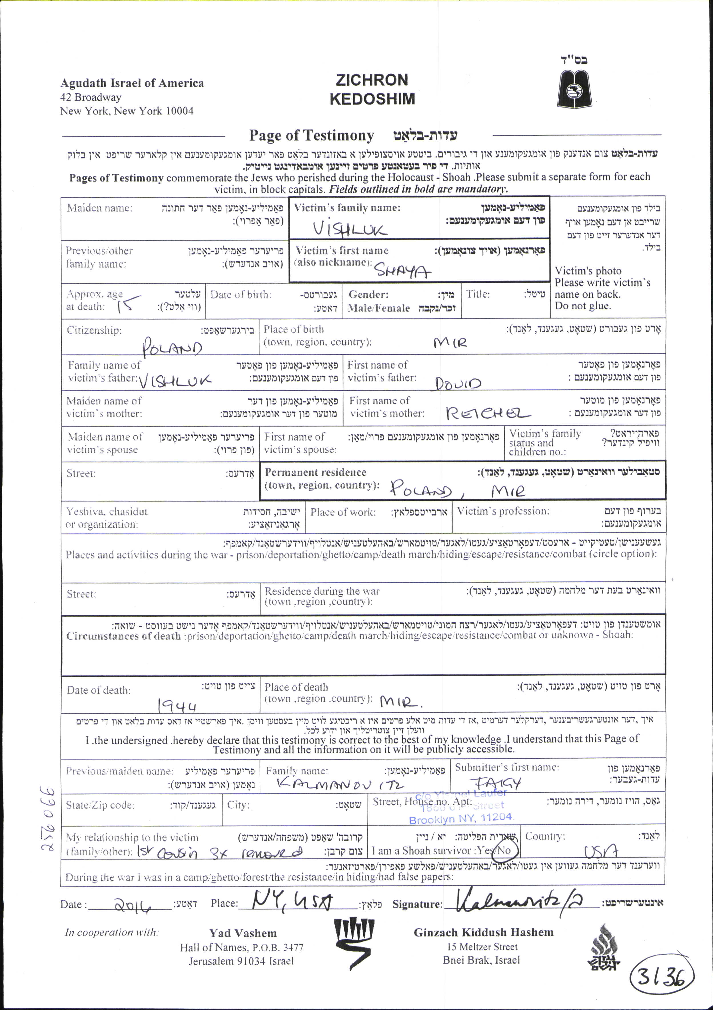 Vishluk Shaya Mir, Pologne Feuille de témoignage