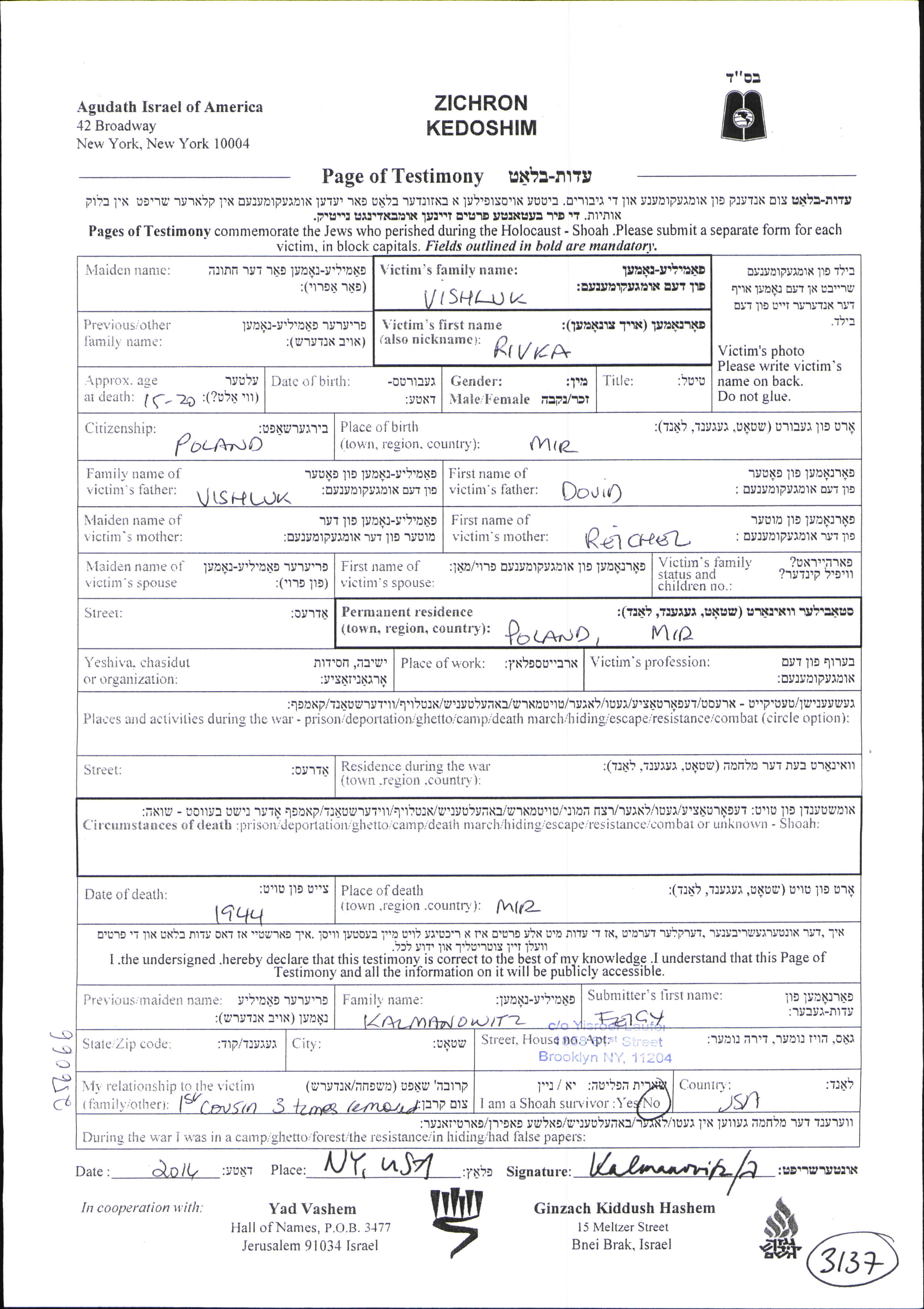 Vishluk Rivka Mir, Pologne Feuille de témoignage