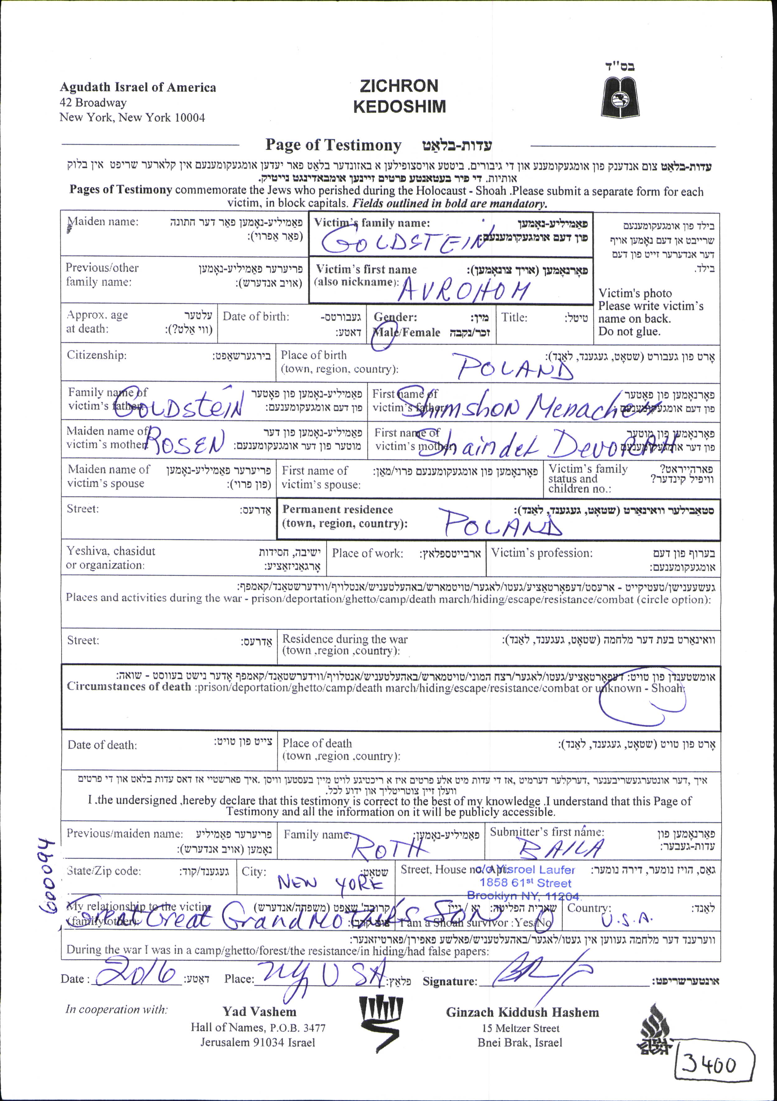 Avrohom Goldstein est né à Pologne, fils de Shimshon Menachem et de Shaindel Devorah née Rosen. Avant la seconde guerre mondiale il vivait à Pologne.