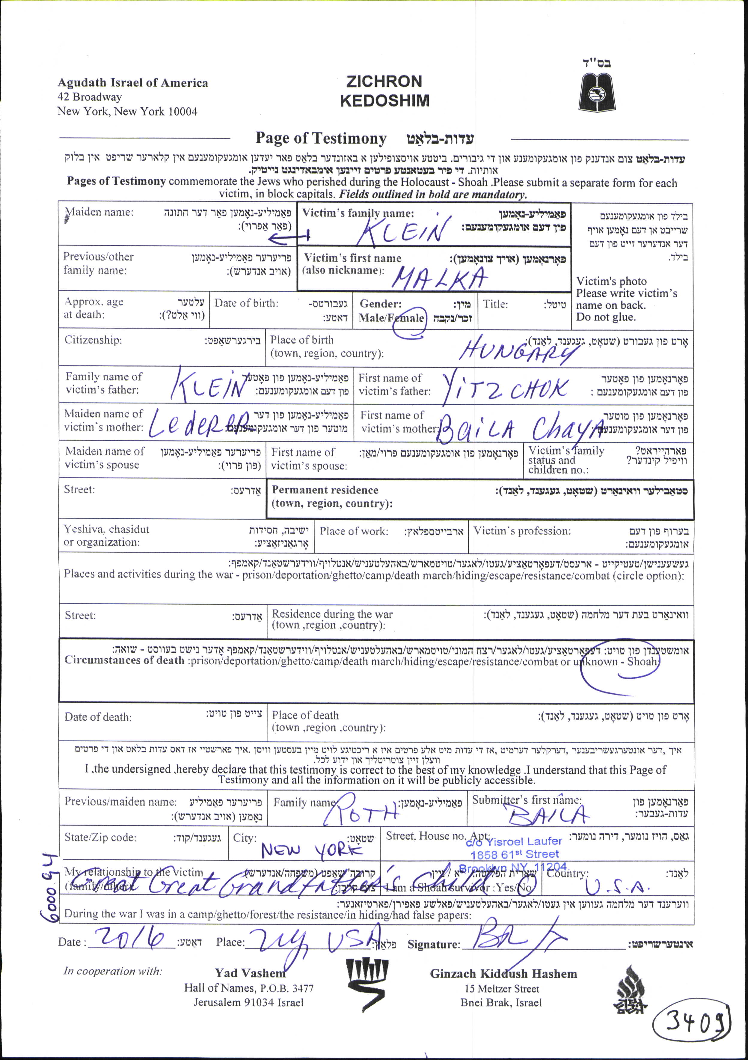 Yad Vashem - Pages of Testimony Names Memorial Collection