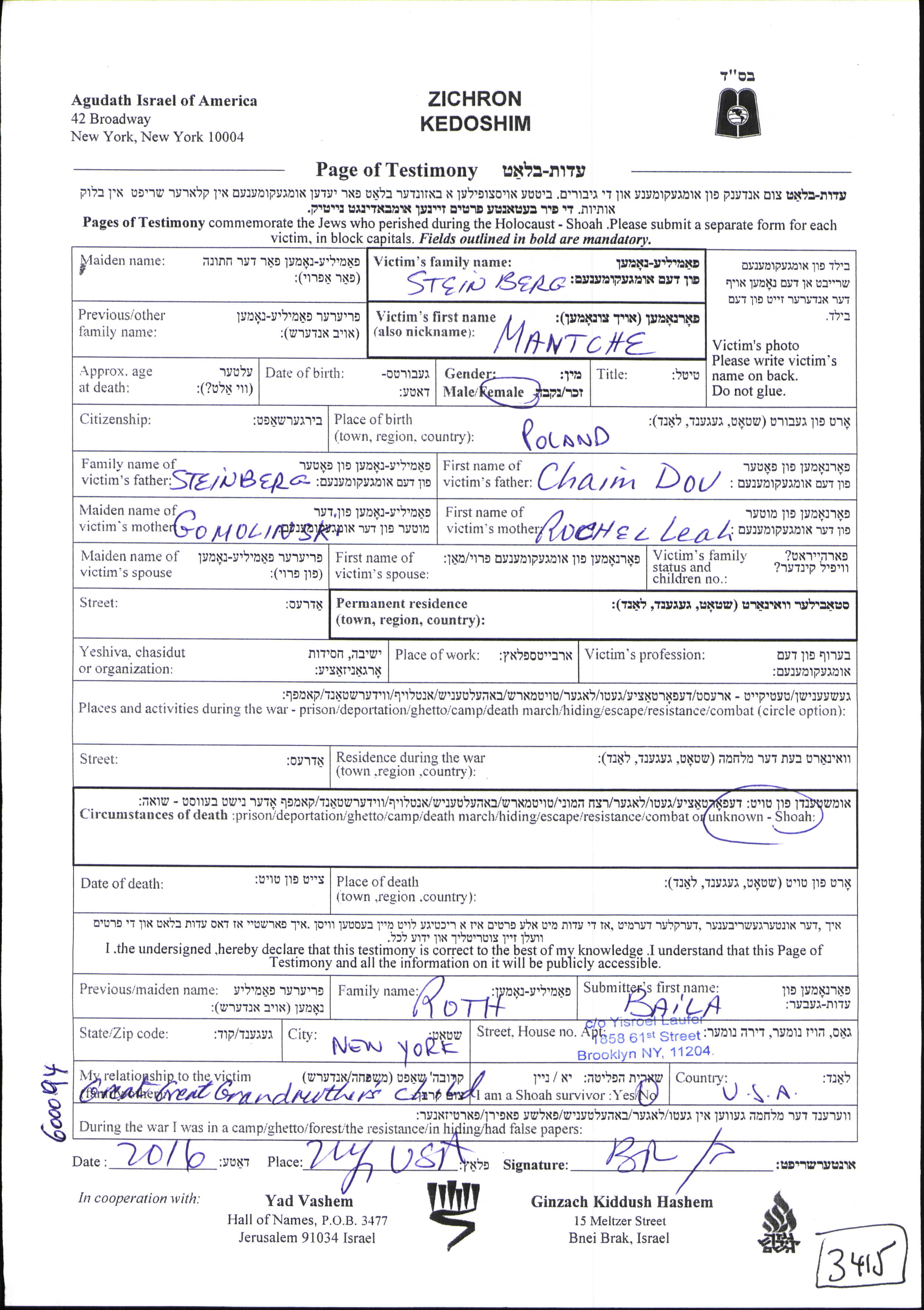 Mantche Steinberg est née à Pologne, fille de Chaim Dov et de Rochel Leah née Gomolinski.