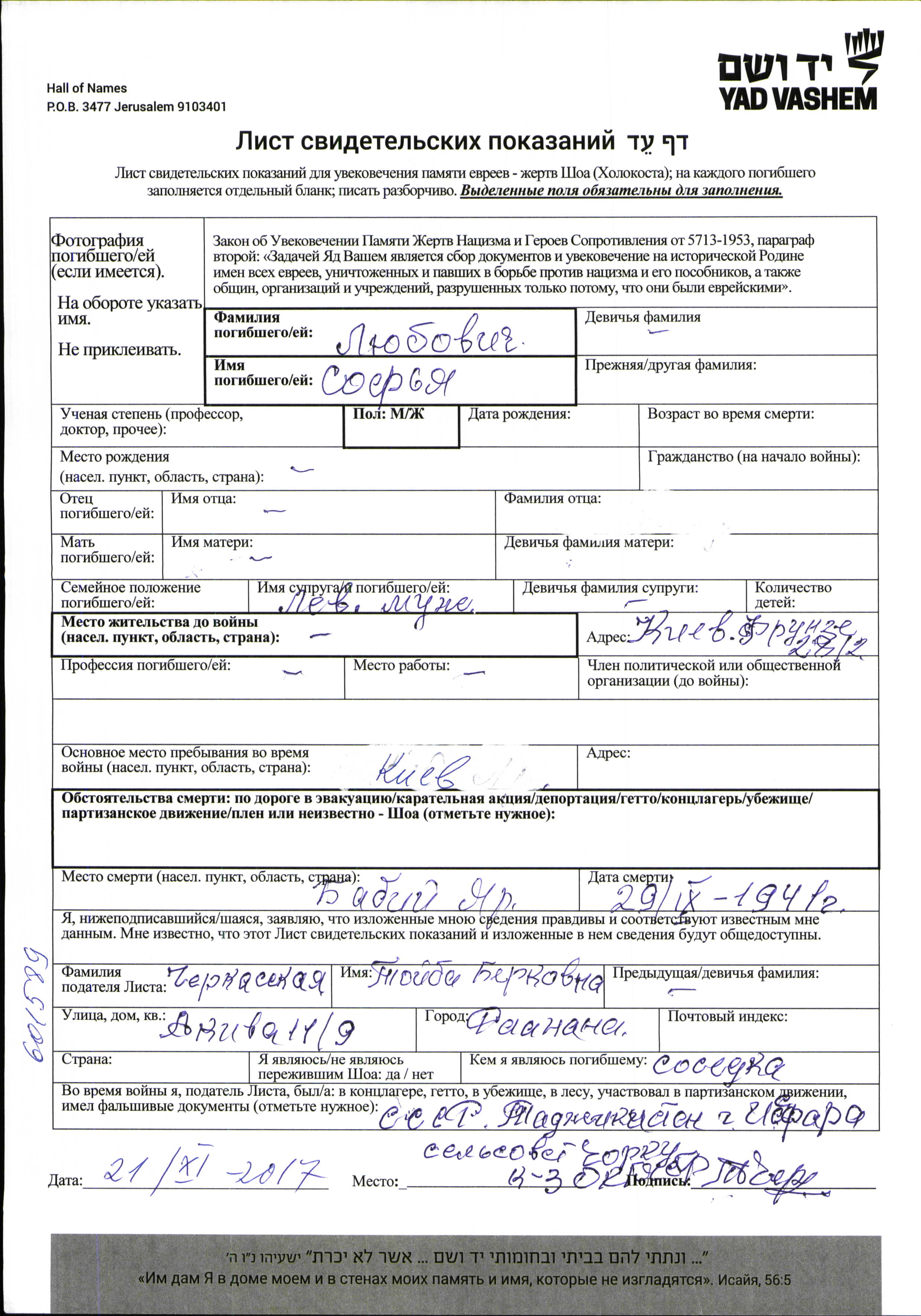 Sofia Lyubovich. Elle était Mariée à Lev. Avant la seconde guerre mondiale elle vivait à Kiev, Ukraine (URSS). Pendant la guerre, elle était à Kiev, Ukraine (URSS).