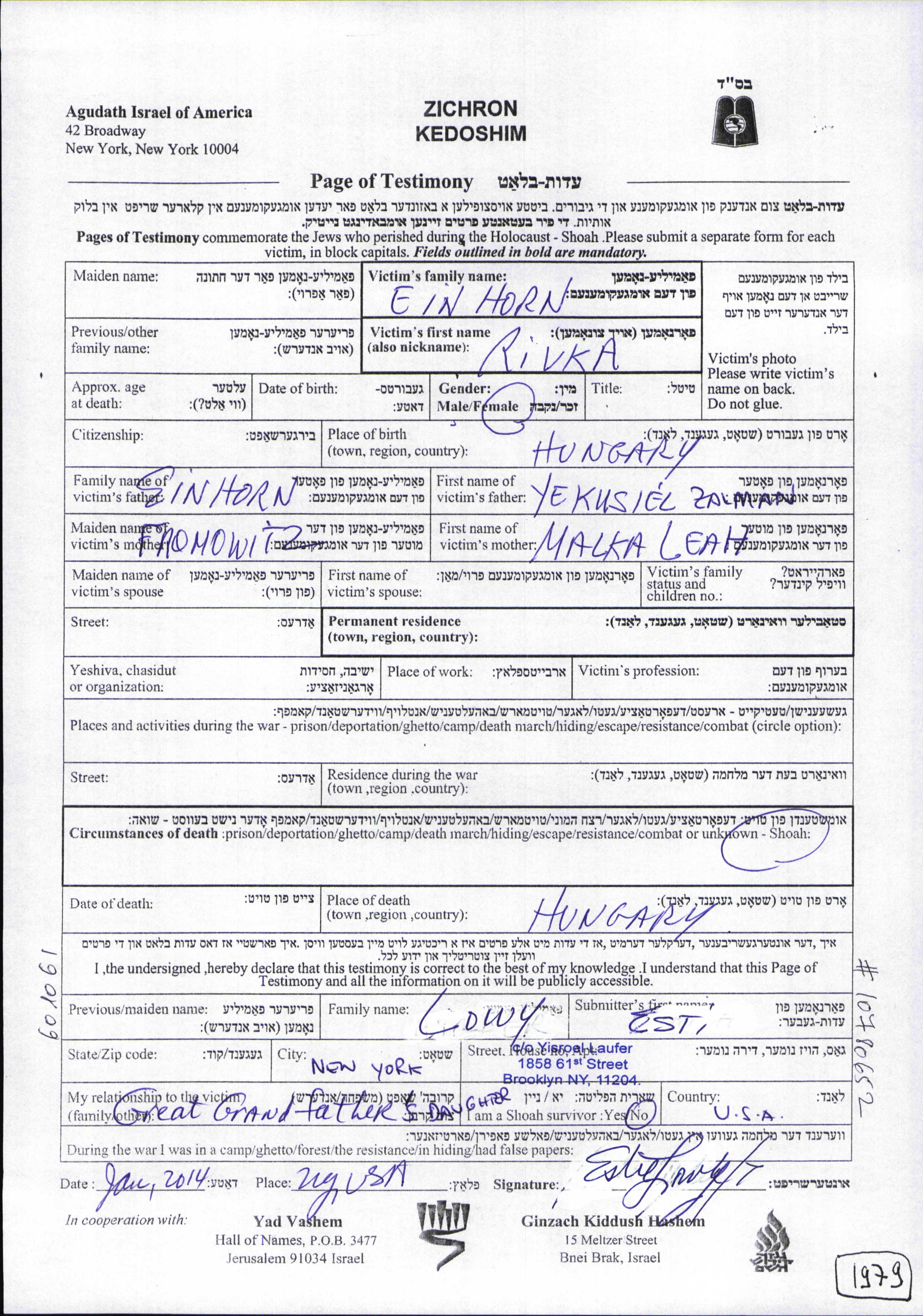 Einhorn Rivka endroit inconnu, Feuille de témoignage