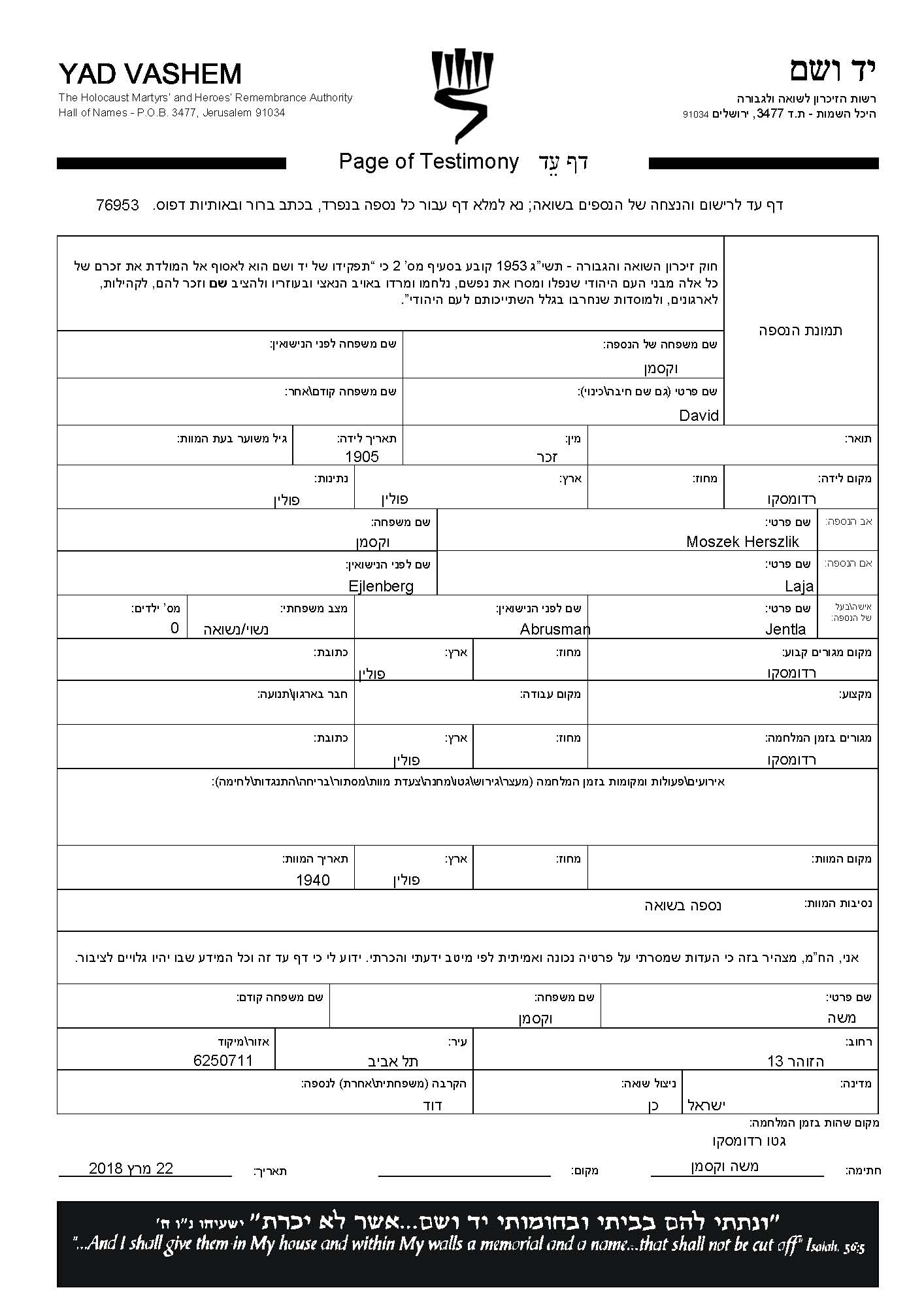 Vaksman David 1905 Radomsko, Pologne Feuille de témoignage (digitale)