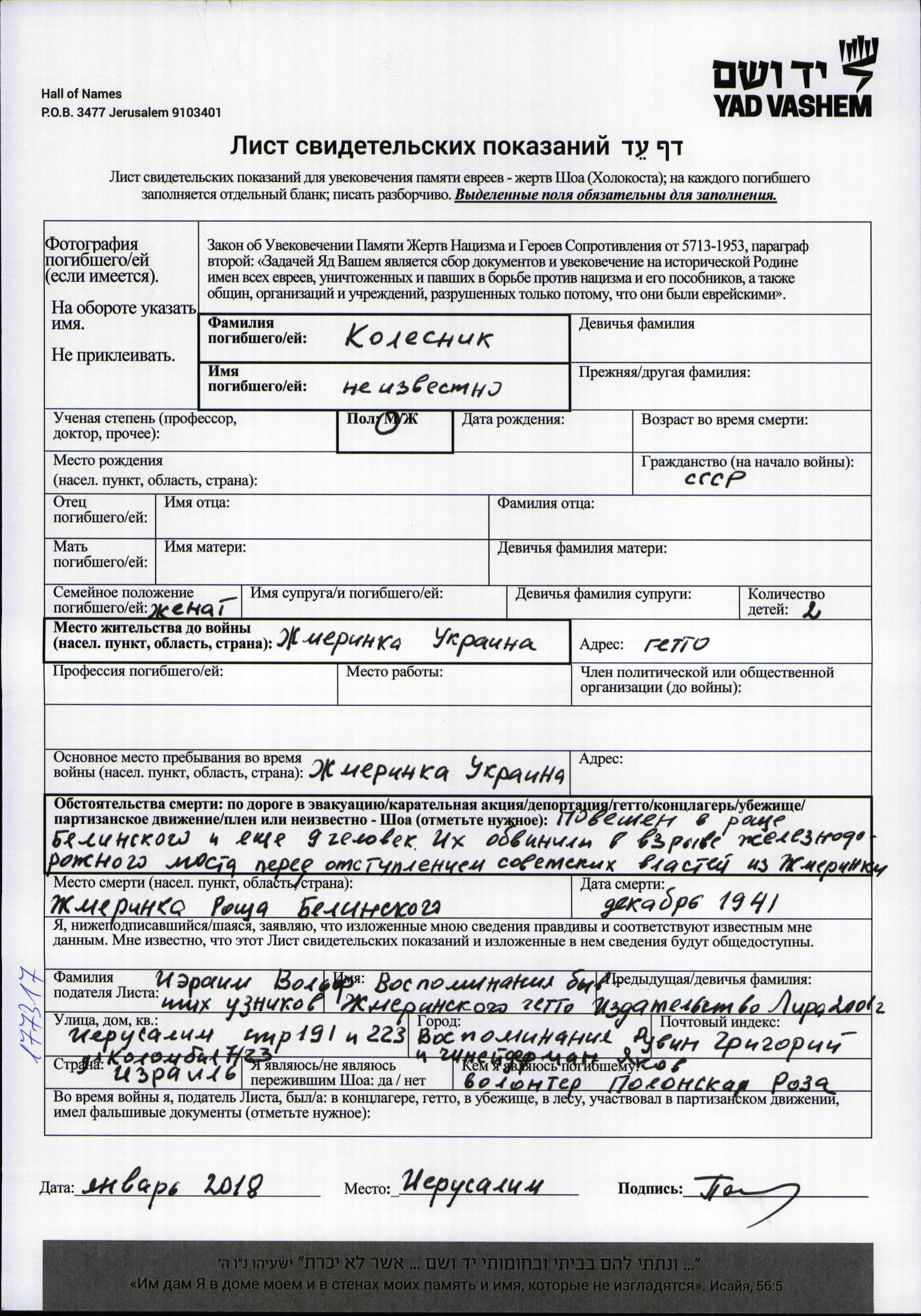 Kolesnik prénom inconnu Zhmerinka, Ukraine (URSS) Feuille de témoignage