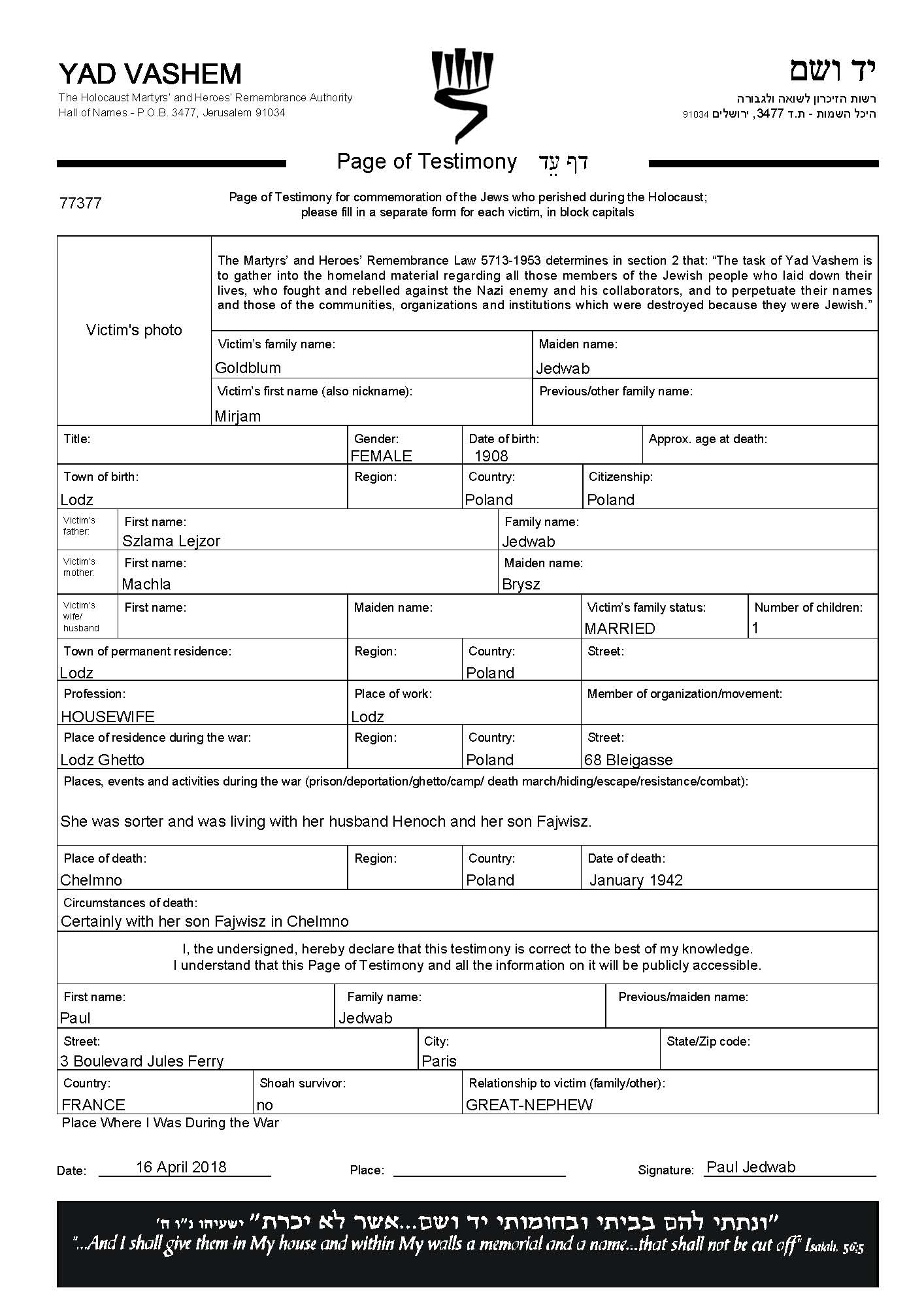 Yad Vashem - Pages of Testimony Names Memorial Collection