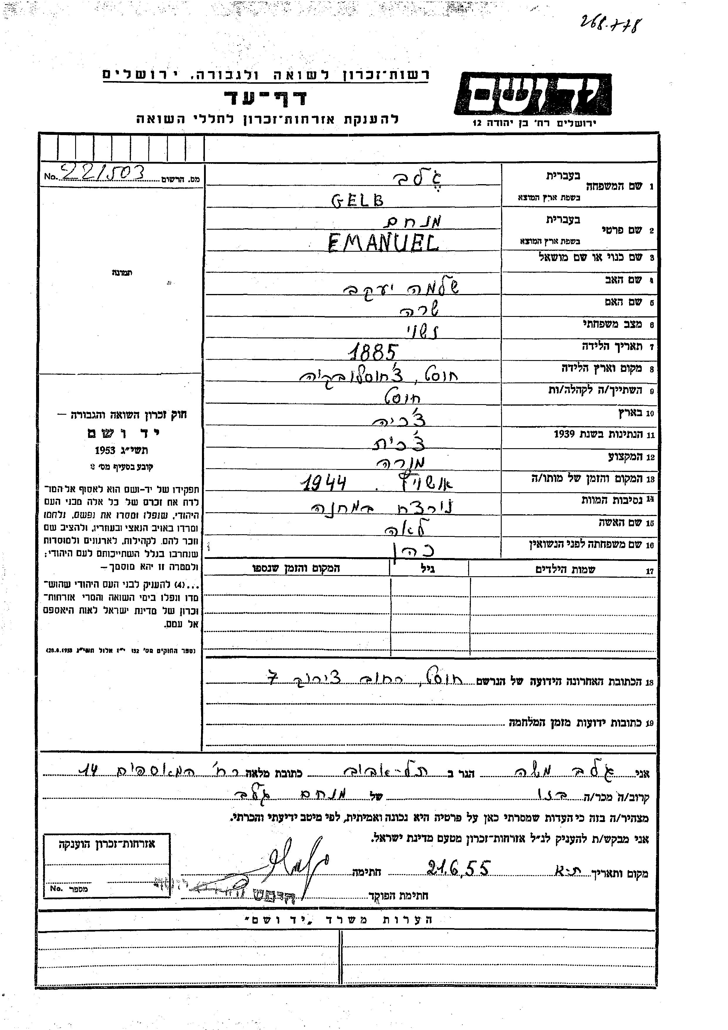 Gelb Emanuel Menakhem 1885 endroit inconnu, Feuille de témoignage