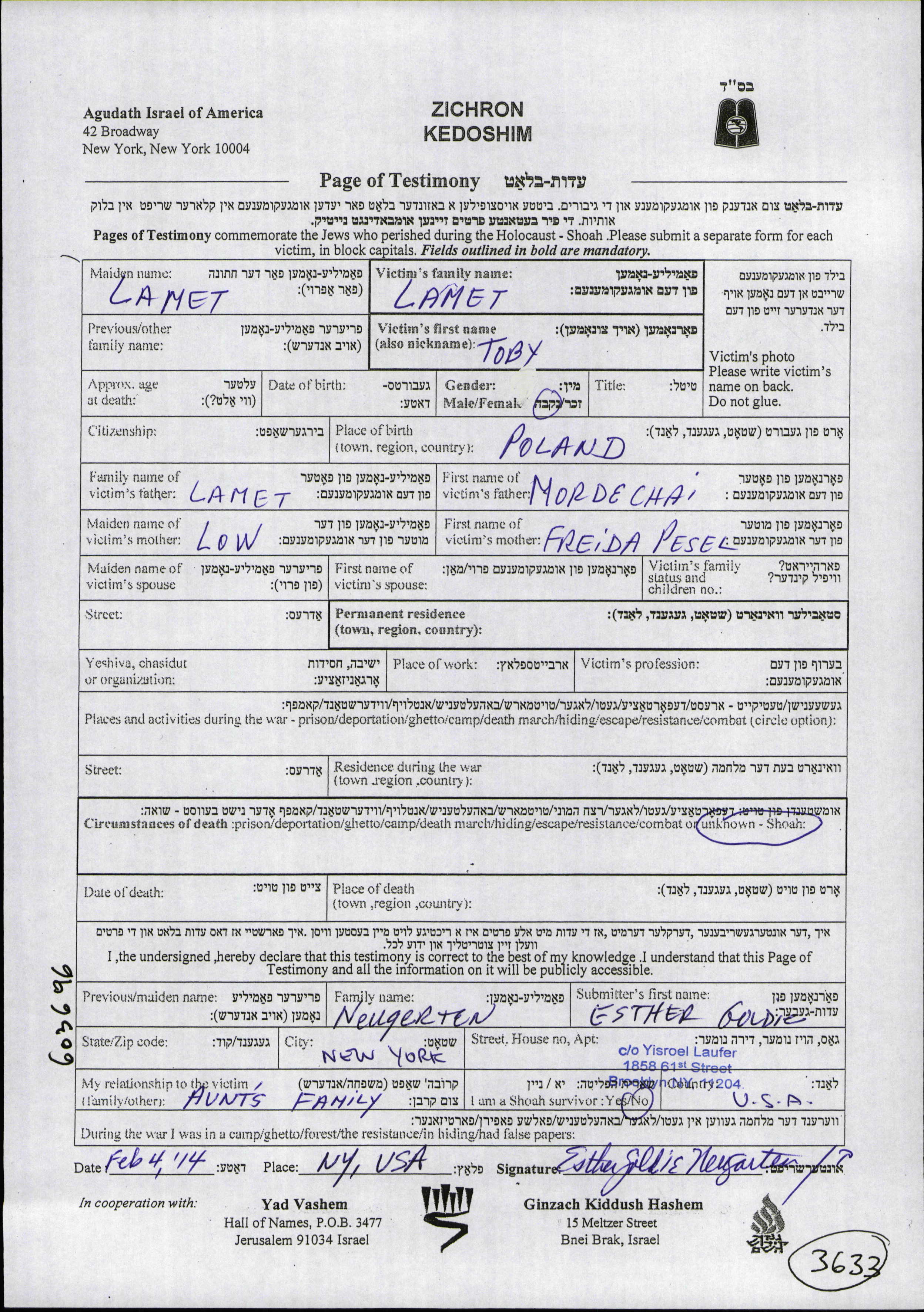 Toby Lamet est née à Pologne, fille de Mordechai et de Freida Pesel née Low.