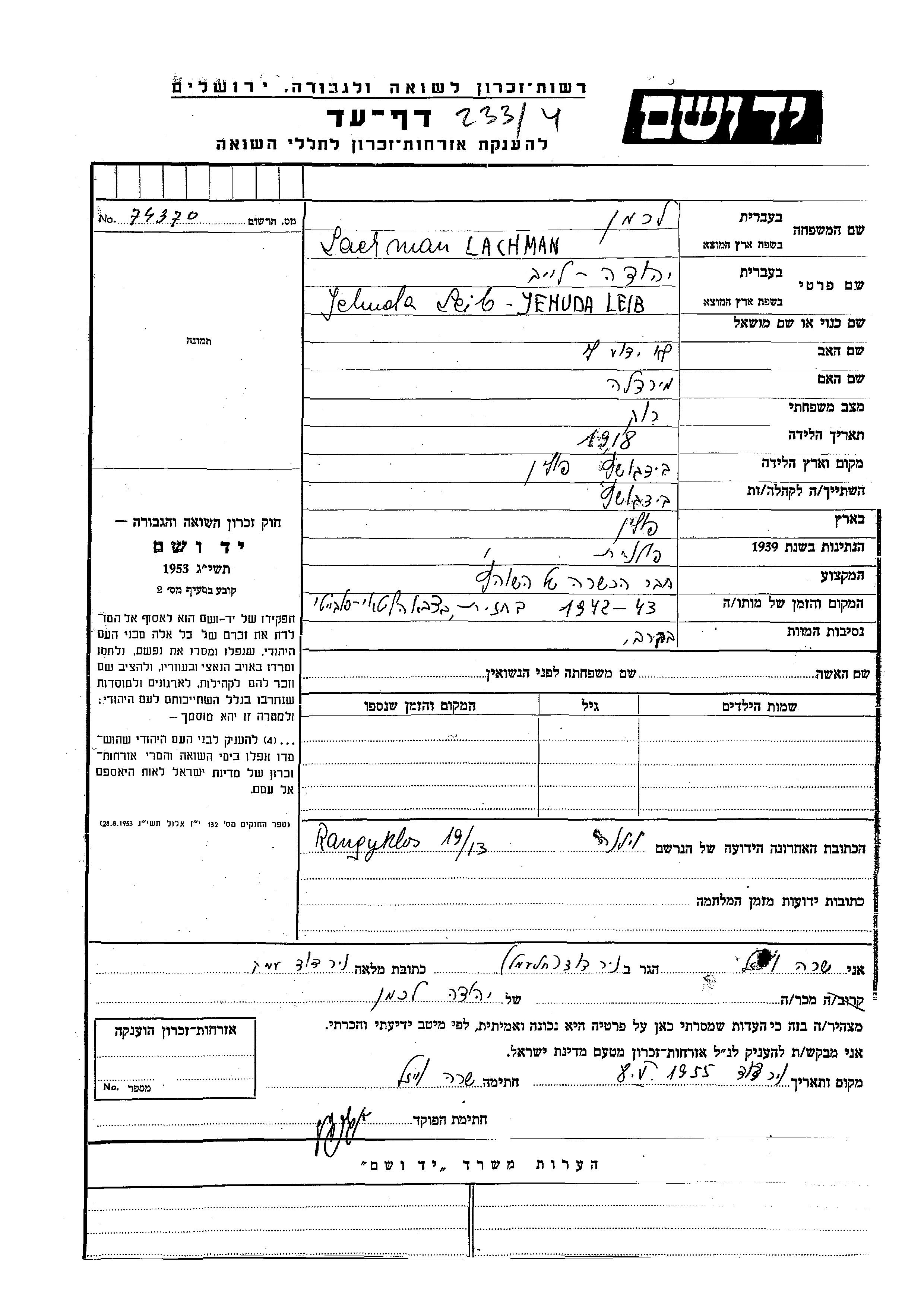 Lachman Jehuda Leib 1918 endroit inconnu, Feuille de témoignage