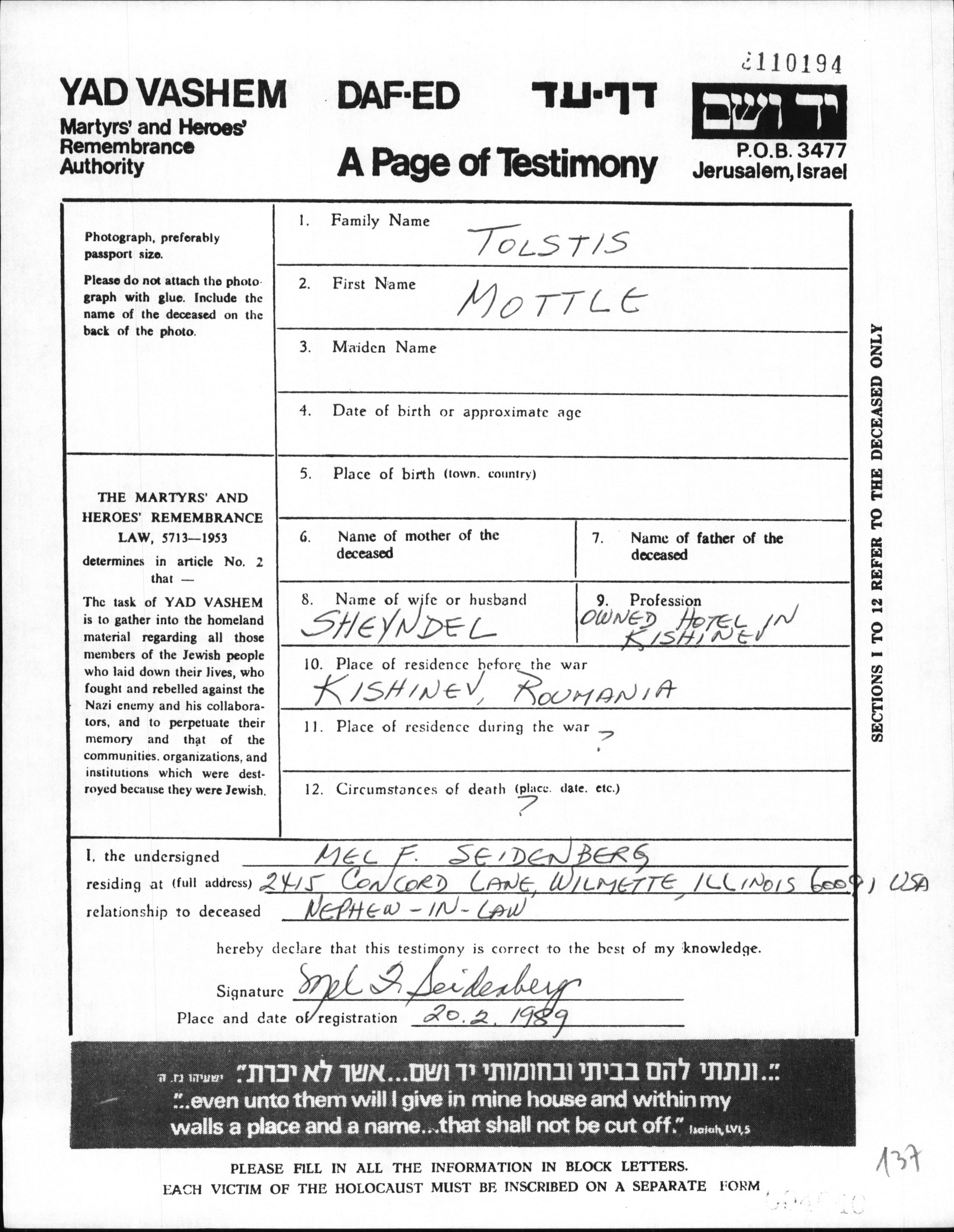 Mordko Tolstis est né à Kishinev, Roumanie. Avant la seconde guerre mondiale il vivait à Kishinev, Roumanie.