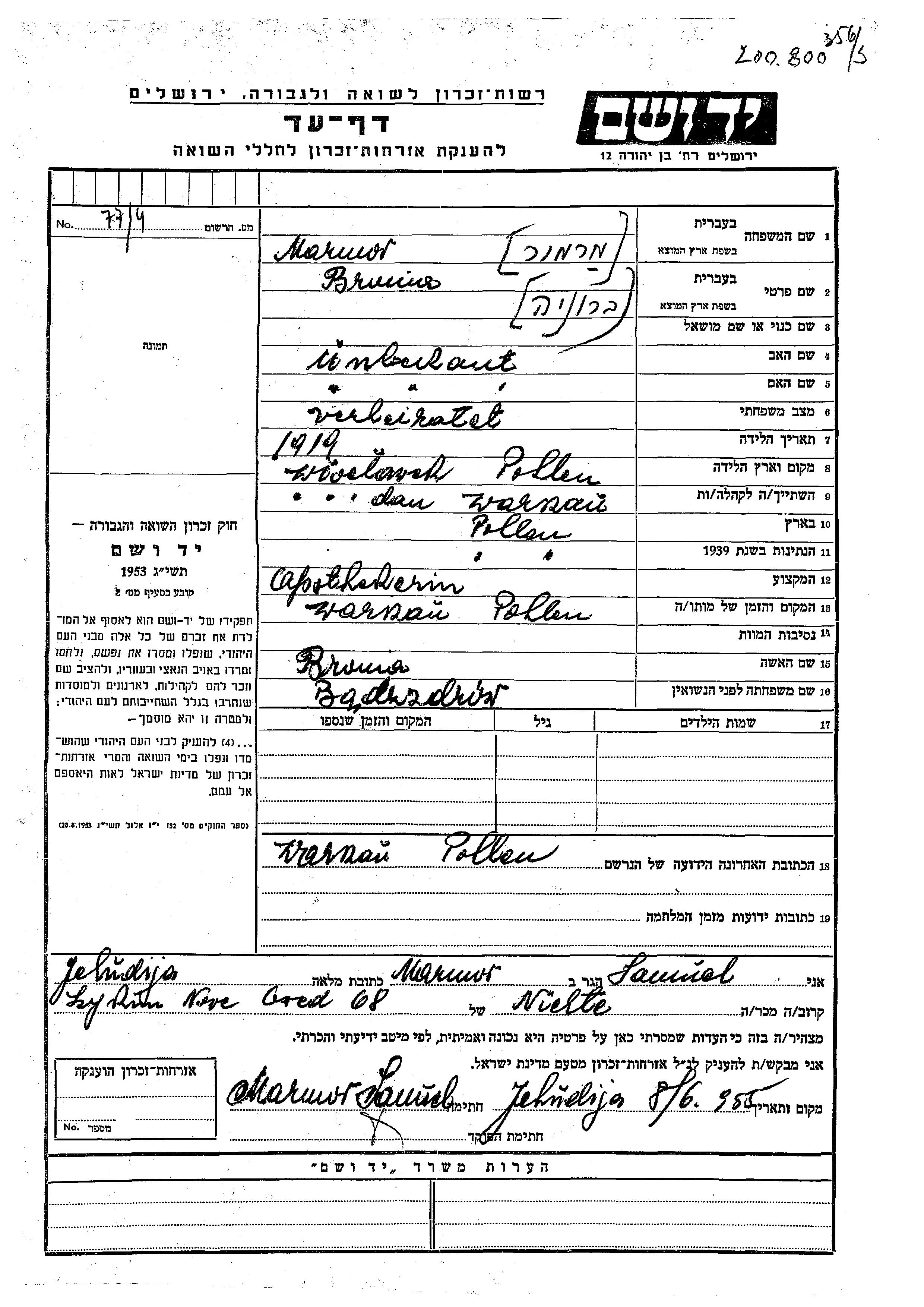 Yad Vashem - Pages of Testimony Names Memorial Collection