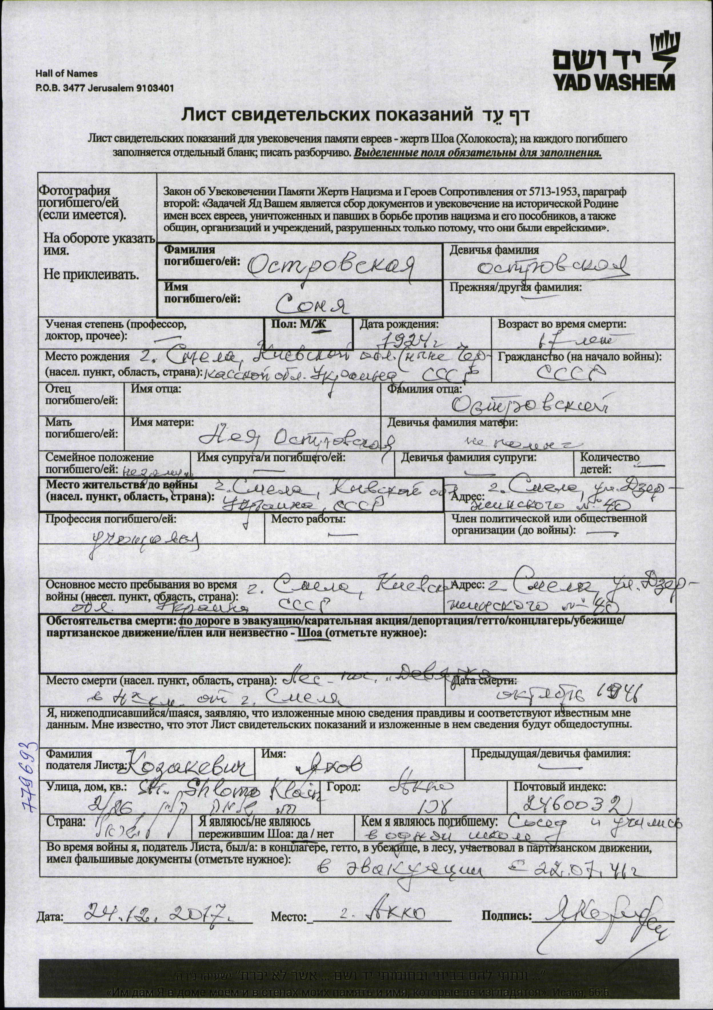 Ostrovskaya Sonya 1924 Smela, Ukraine (URSS) Feuille de témoignage