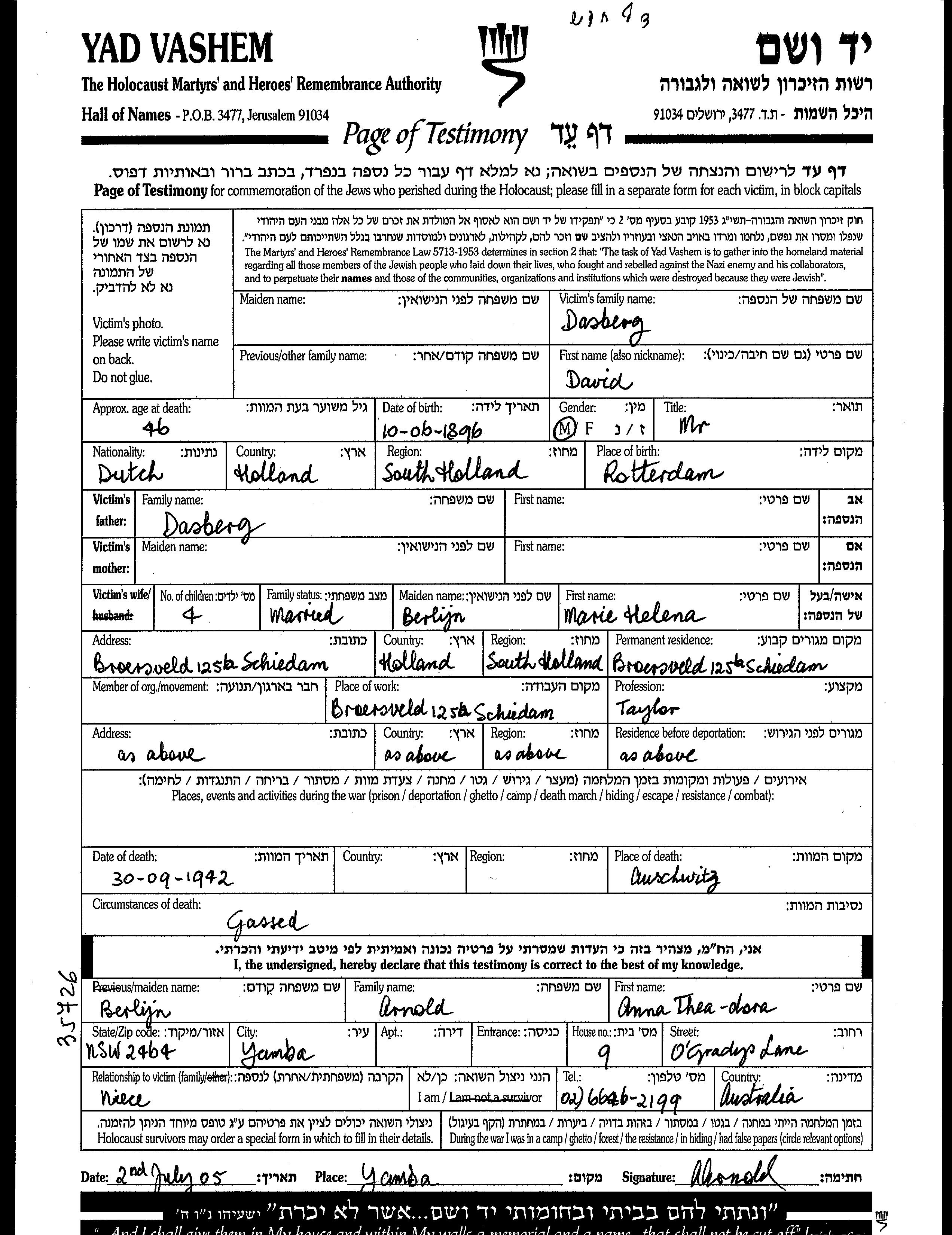 Dasberg David 1896 Schiedam, Pays-Bas Feuille de témoignage