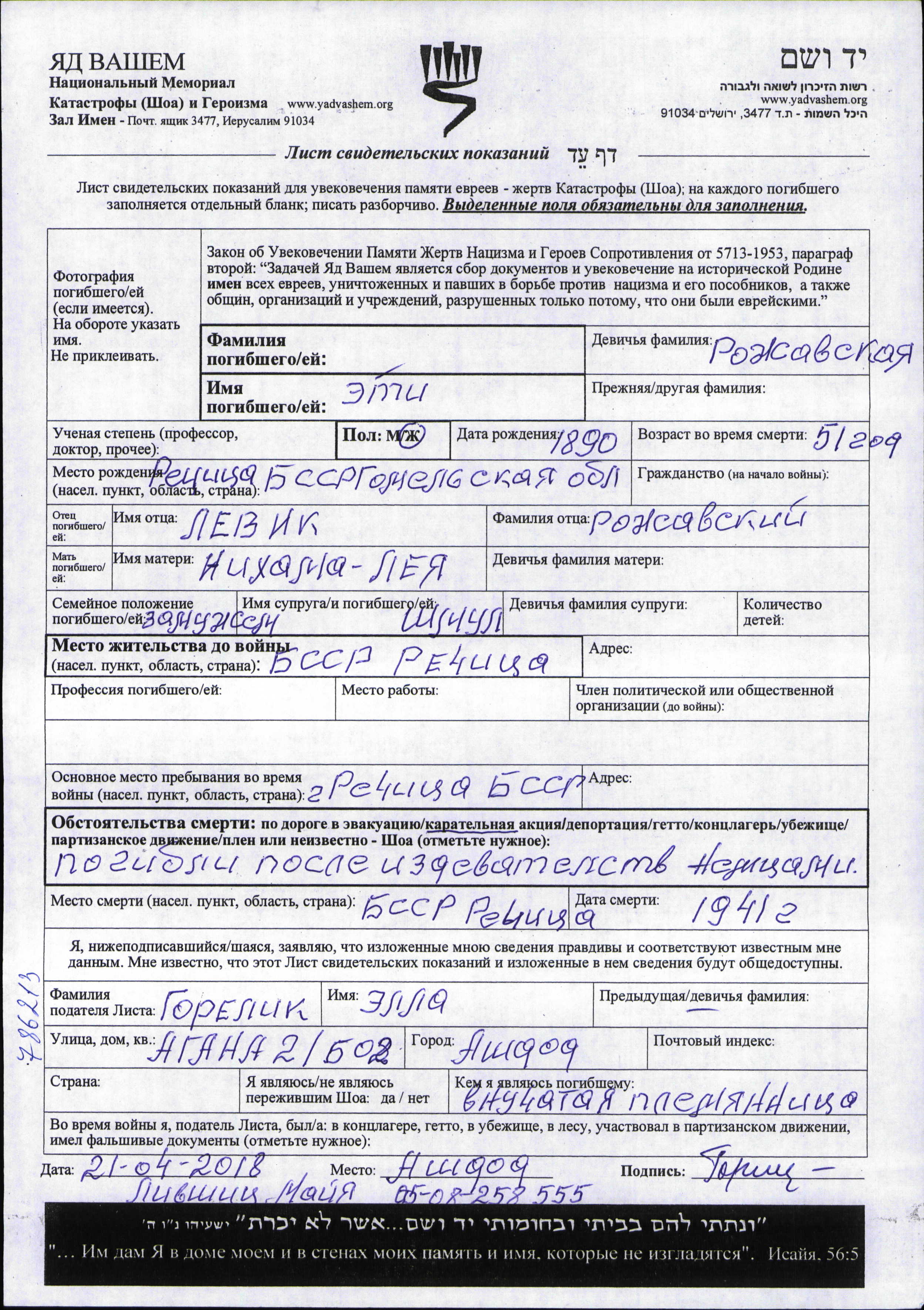Eti nom inconnu née Rozhavskaya est née à Rechitsa, Bélorussie (URSS) en 1890, fille de Levik et de Nikhama Leya. Elle était Mariée à Shmul. Avant la seconde guerre mondiale elle vivait à Rechitsa, Bélorussie (URSS). Pendant la guerre, elle était à Rechitsa, Bélorussie (URSS).