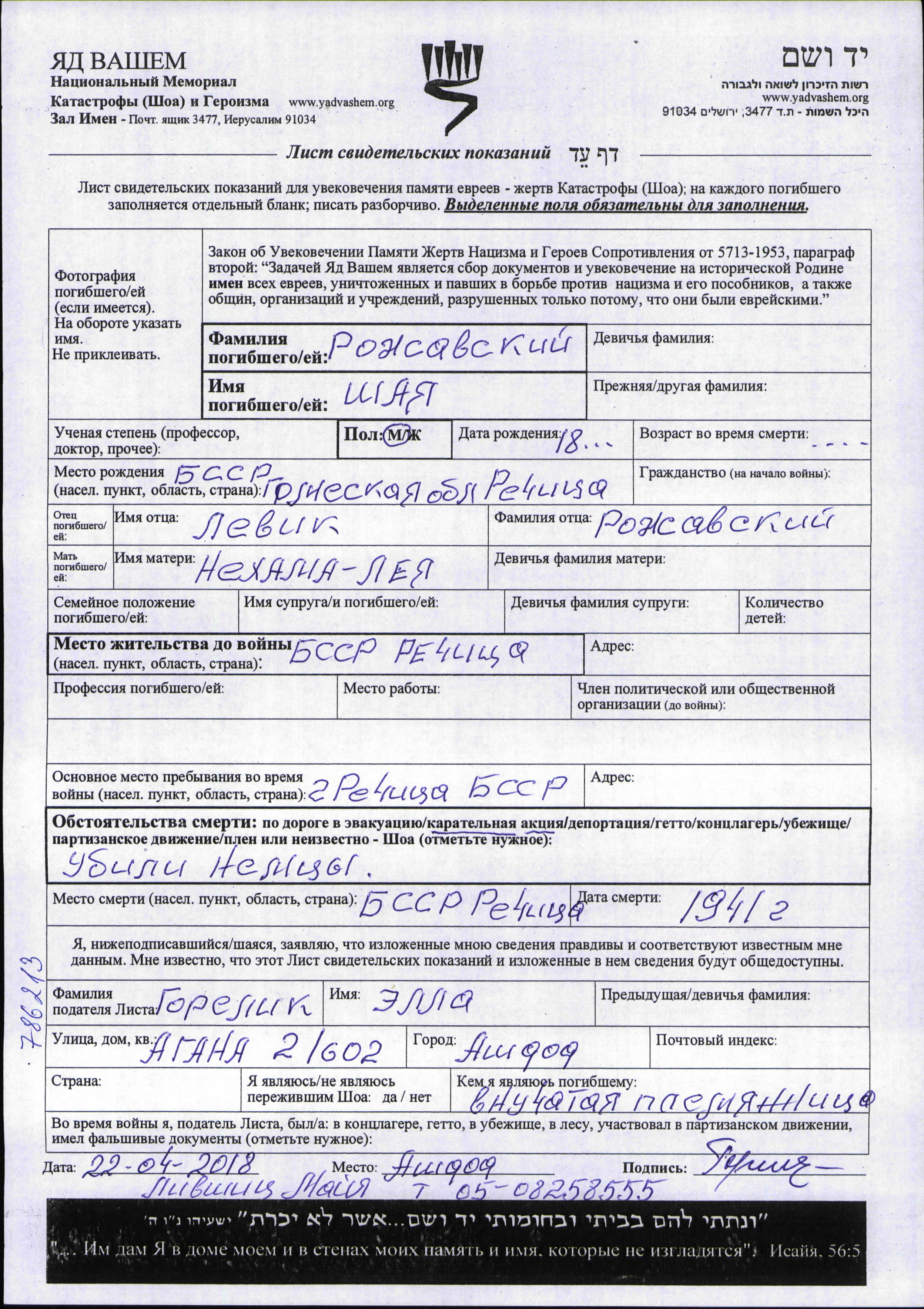 Rozhavski Shaya Rechitsa, Bélorussie (URSS) Feuille de témoignage