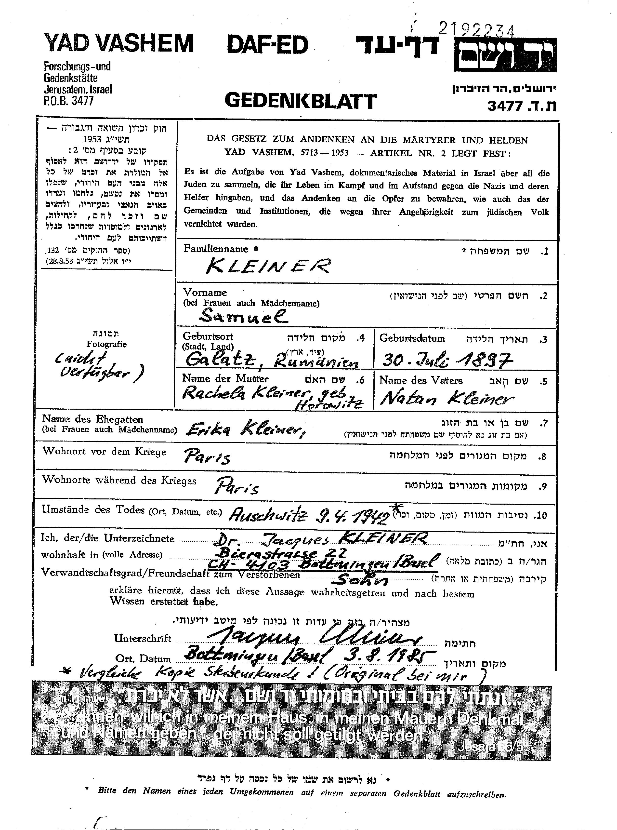 Kleiner Shmuel 1897 Paris, France Feuille de témoignage