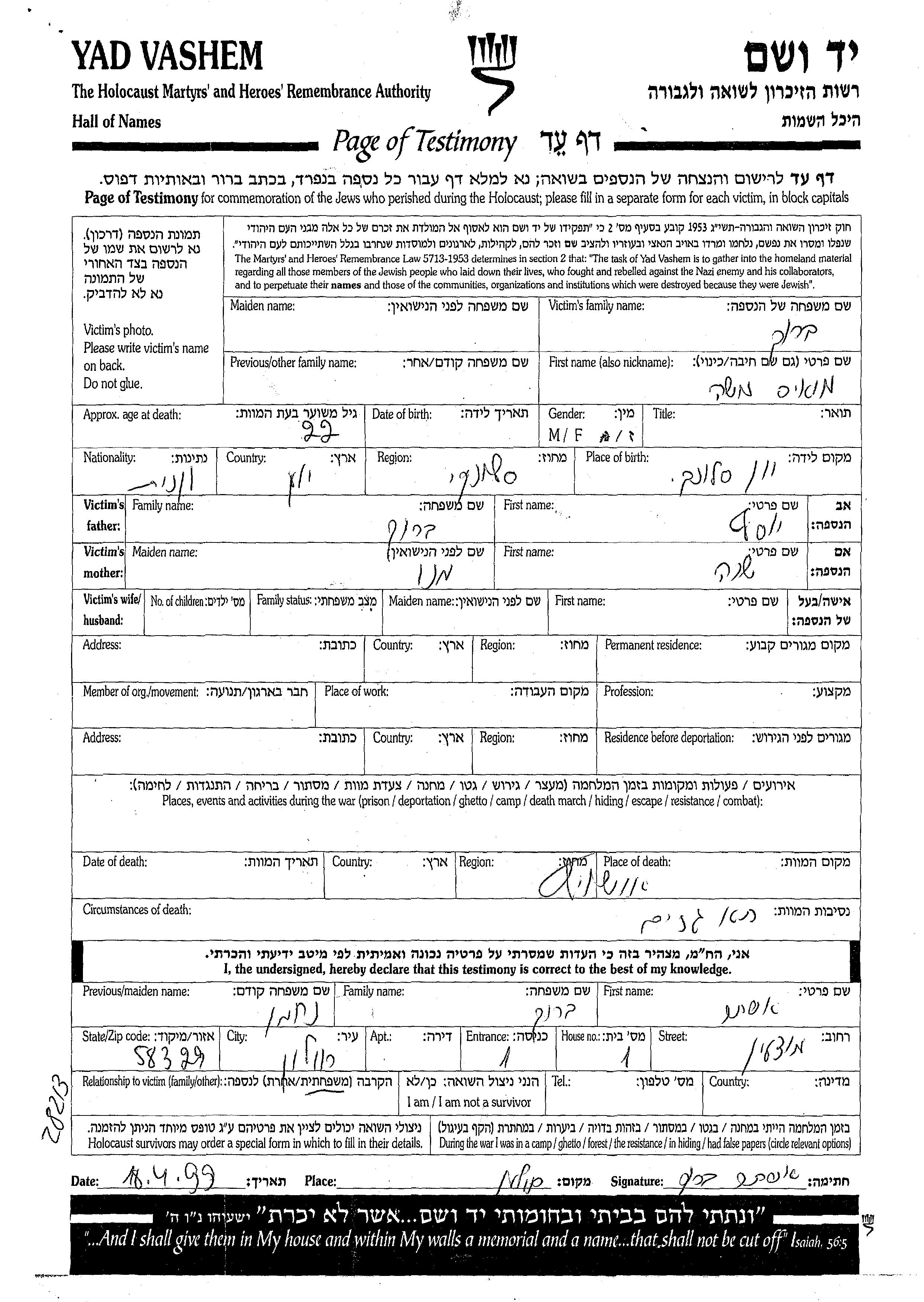 Barukh | Moshe | endroit inconnu, | Feuille de témoignage | |