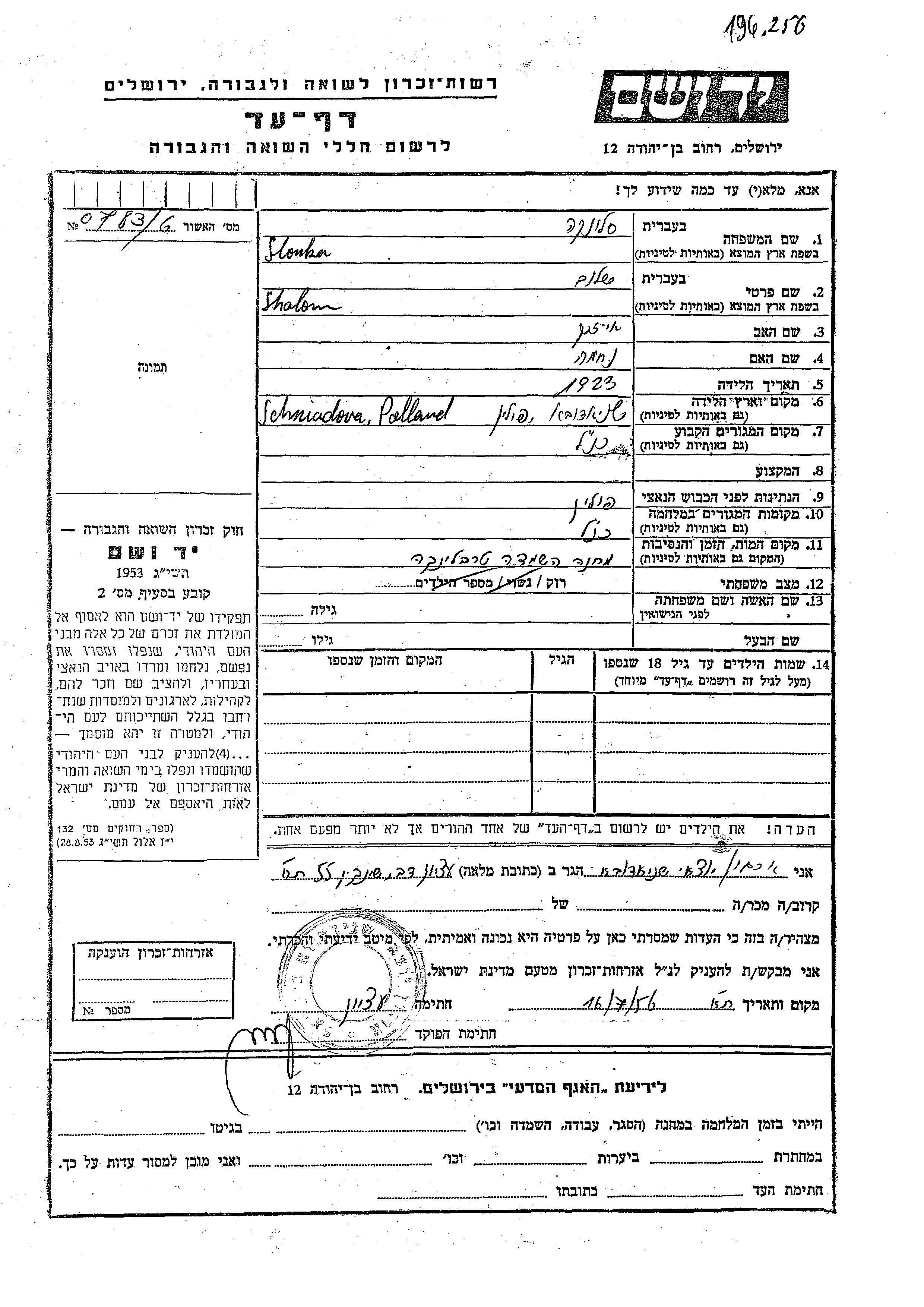 Shalom Slonka est né à Sniadowo, Pologne en 1923, fils de Aizik et de Nekhama. Il était Célibataire. Avant la seconde guerre mondiale il vivait à Sniadowo, Pologne. Au cours de la guerre, il était à Sniadowo, Pologne.