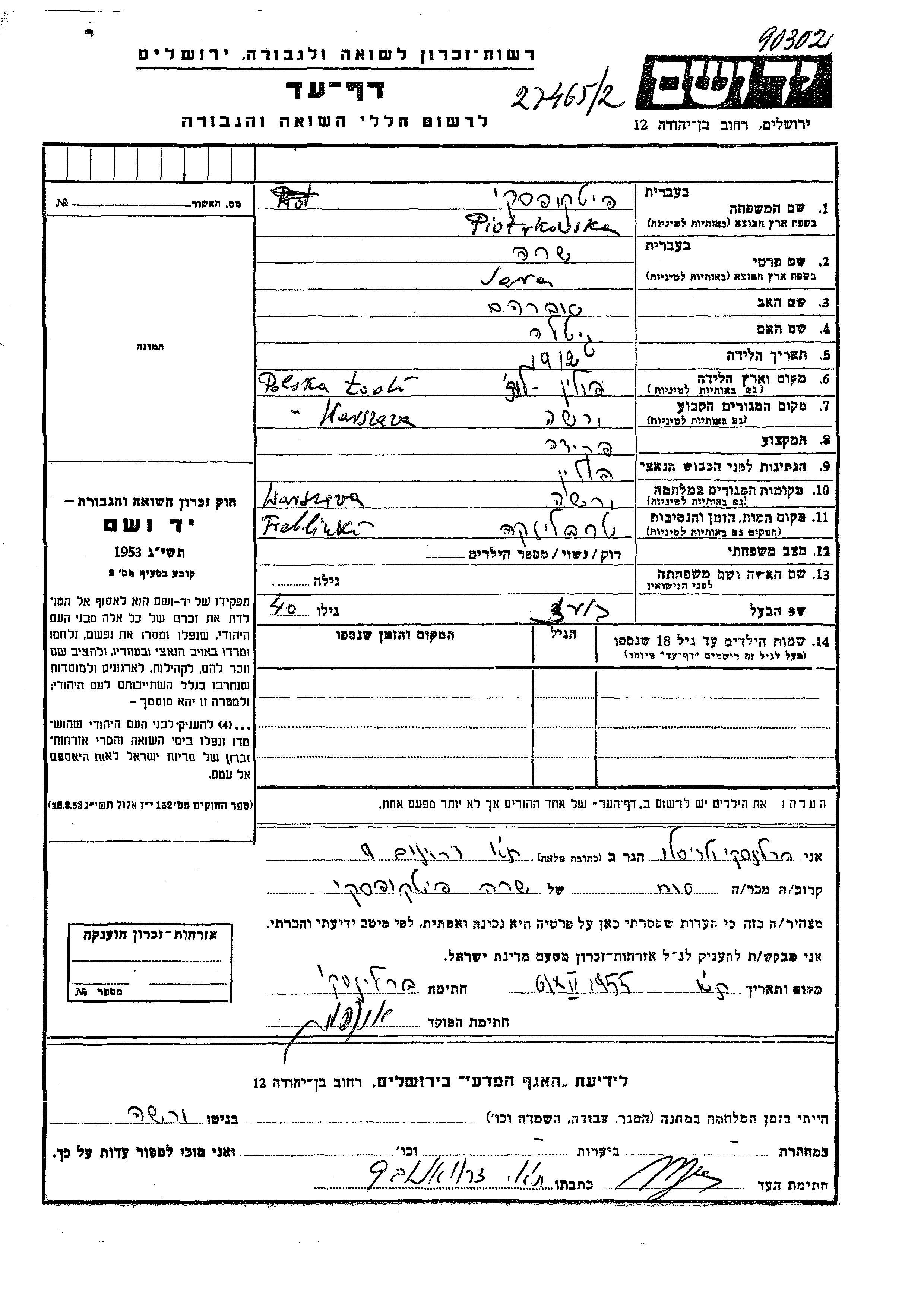 Piotrkowska Pitkovski Sara 1912 Warsaw, Pologne Feuille de témoignage