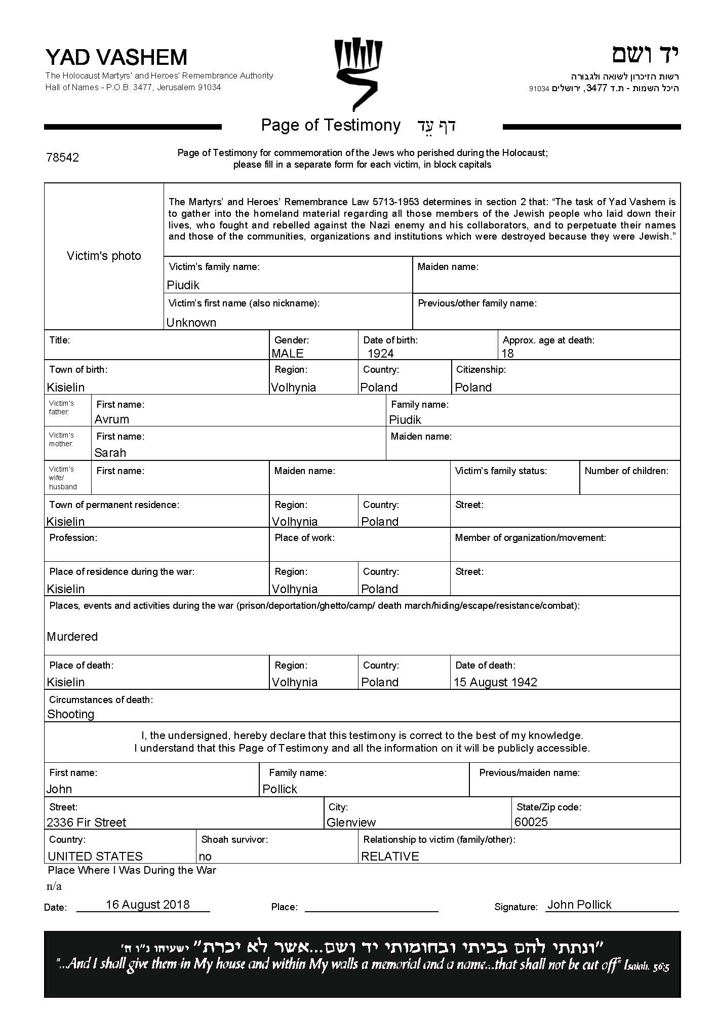 prénom inconnu Piudik est né à Kisielin, Pologne en 1924, fils de Avrum et de Sarah. Avant la seconde guerre mondiale il vivait à Kisielin, Pologne. Au cours de la guerre, il était à Kisielin, Pologne.