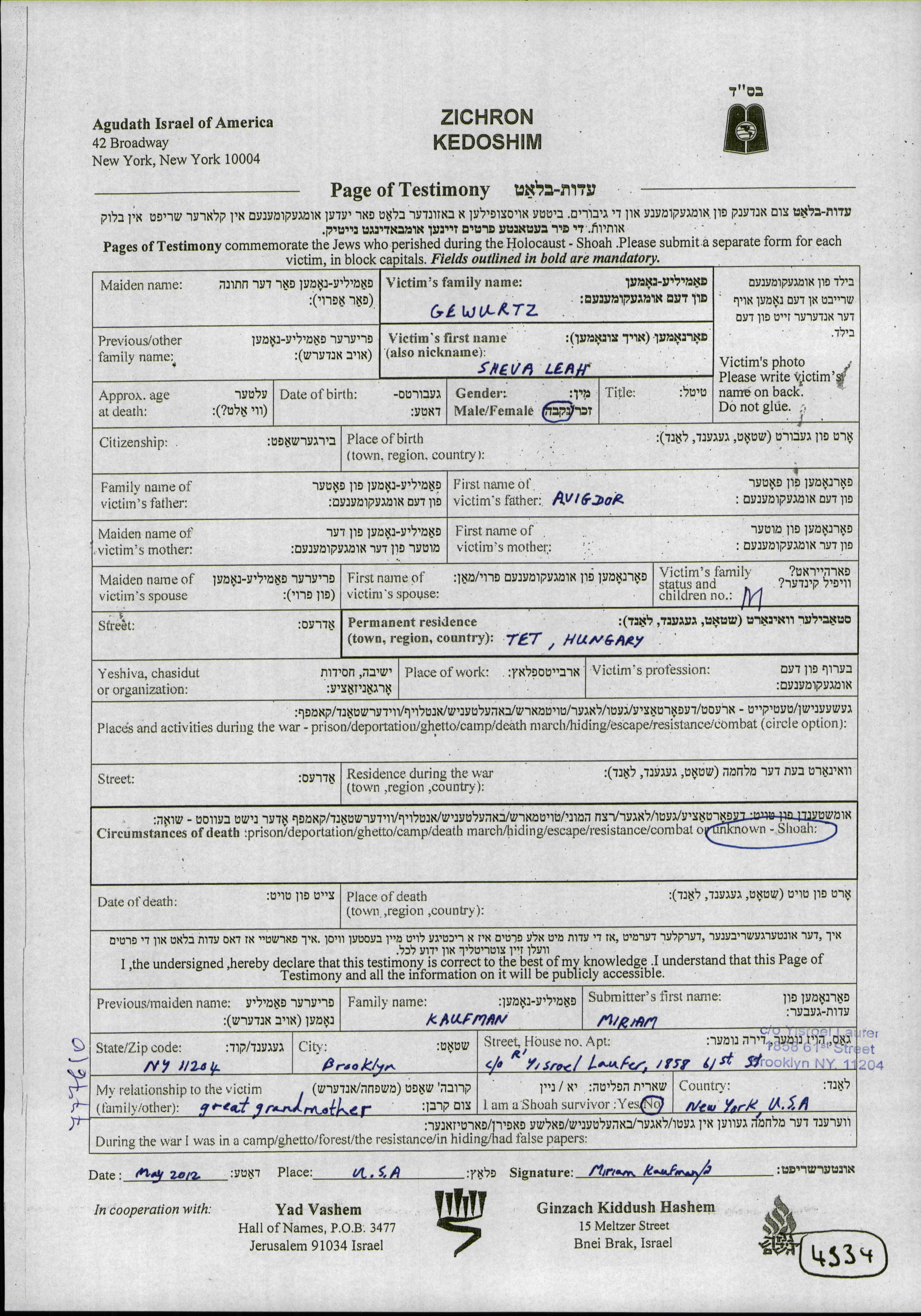 Gewurtz Sheva Leah Tet, Hongrie Feuille de témoignage